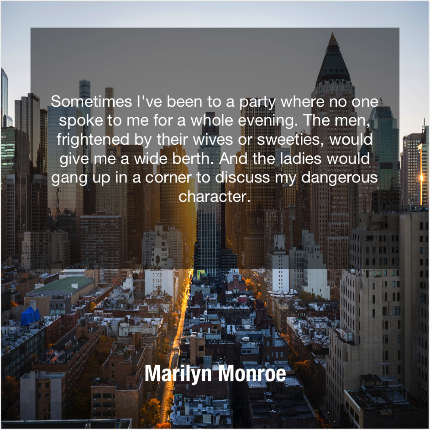 Marilyn Monroe Marilyn Monroe – Sometimes I’ve been to a… September 3, 2019 admin “Sometimes I’ve been to a party where no one spoke to me for a whole evening. The men, frightened by their wives or sweeties, would give me a wide berth. And the ladies would gang up in a corner to discuss my dangerous character.”-Marilyn Monroe