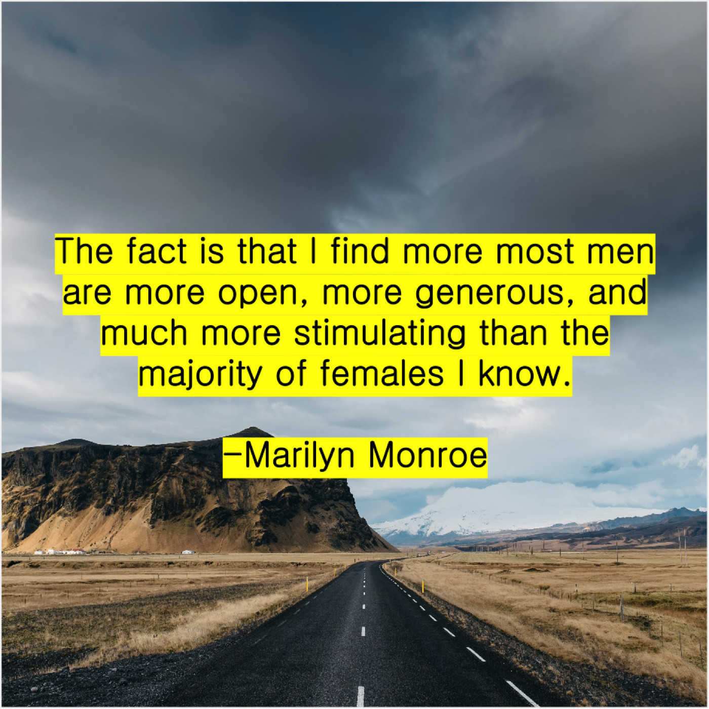 Marilyn Monroe Marilyn Monroe – The fact is that I… March 22, 2019 admin “The fact is that I find more most men are more open, more generous, and much more stimulating than the majority of females I know.”-Marilyn Monroe