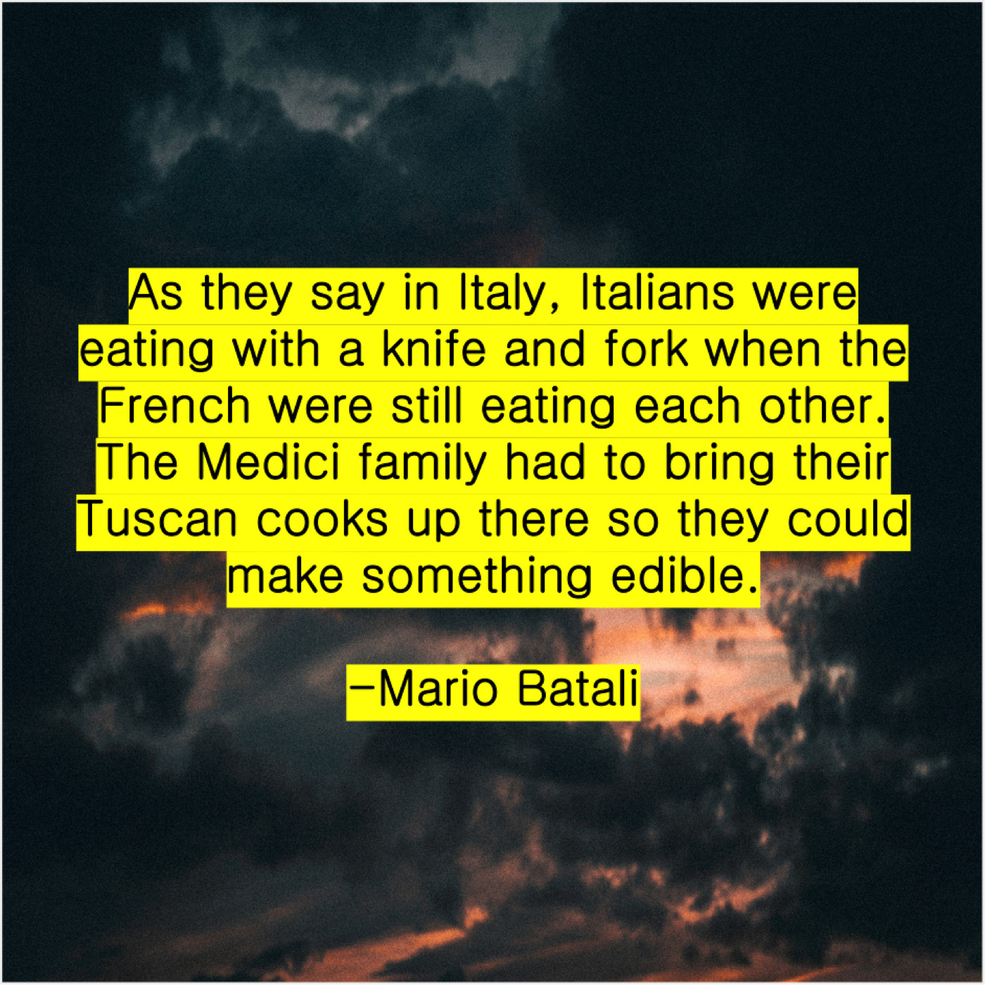Mario Batali Mario Batali – As they say in Italy… August 25, 2019 admin “As they say in Italy, Italians were eating with a knife and fork when the French were still eating each other. The Medici family had to bring their Tuscan cooks up there so they could make something edible.”-Mario Batali