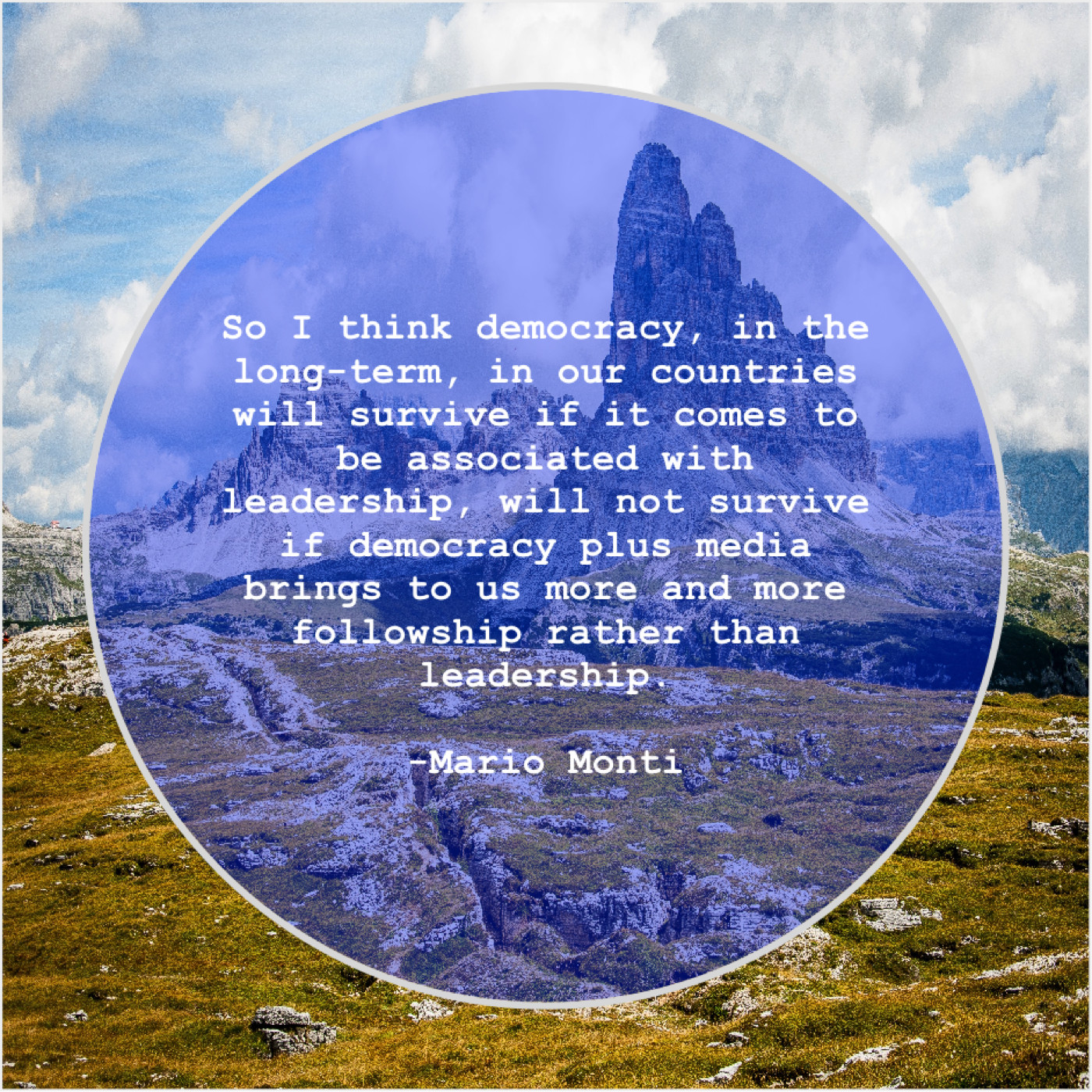 Mario Monti Mario Monti – So I think democracy, in… December 4, 2018 admin “So I think democracy, in the long-term, in our countries will survive if it comes to be associated with leadership, will not survive if democracy plus media brings to us more and more followship rather than leadership.”-Mario Monti