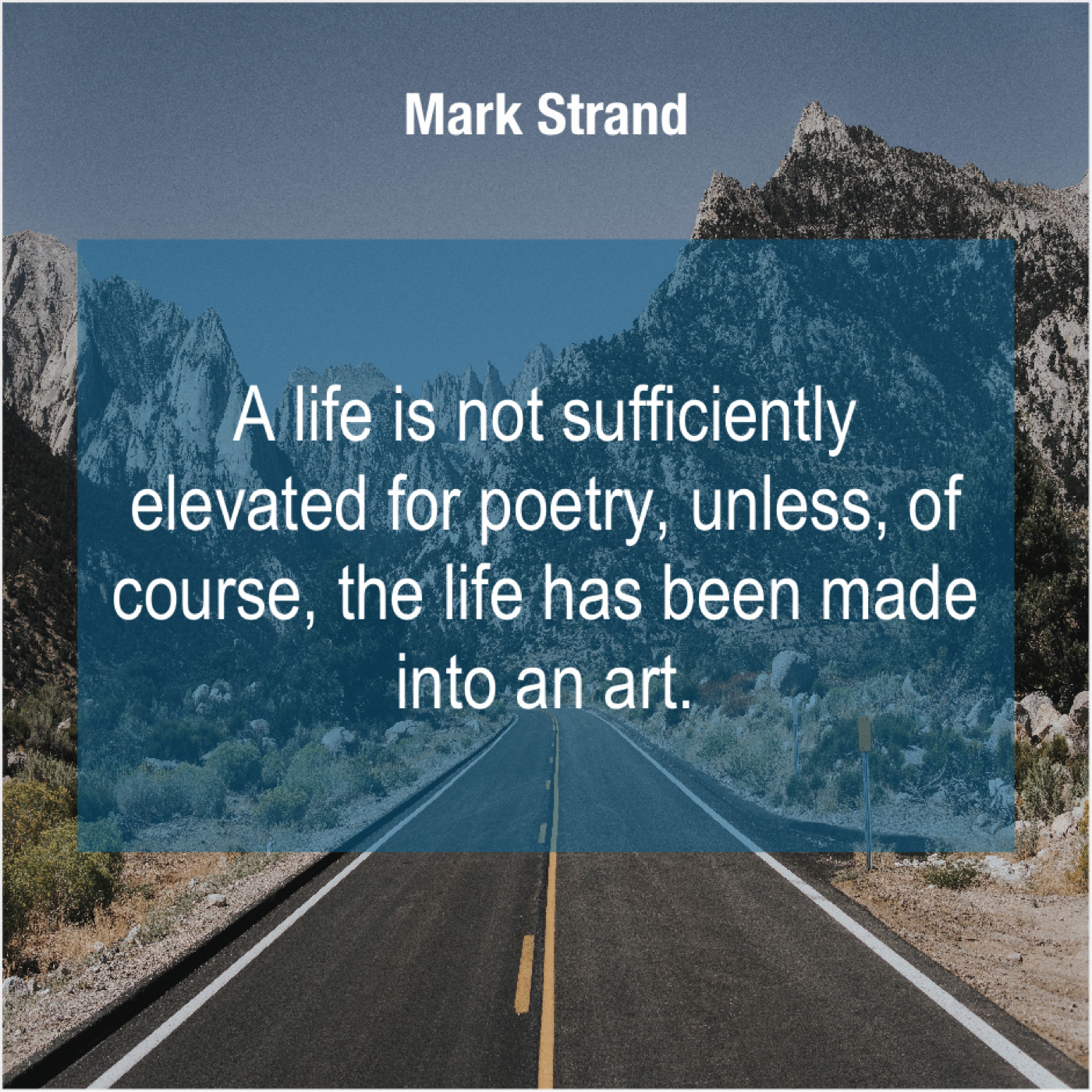 Mark Strand Mark Strand – A life is not sufficiently… August 17, 2019 admin “A life is not sufficiently elevated for poetry, unless, of course, the life has been made into an art.”-Mark Strand