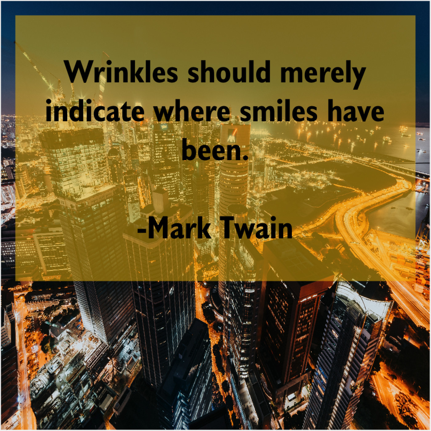 Mark Twain Mark Twain – Wrinkles should merely indicate where… October 16, 2019 admin “Wrinkles should merely indicate where smiles have been.”-Mark Twain