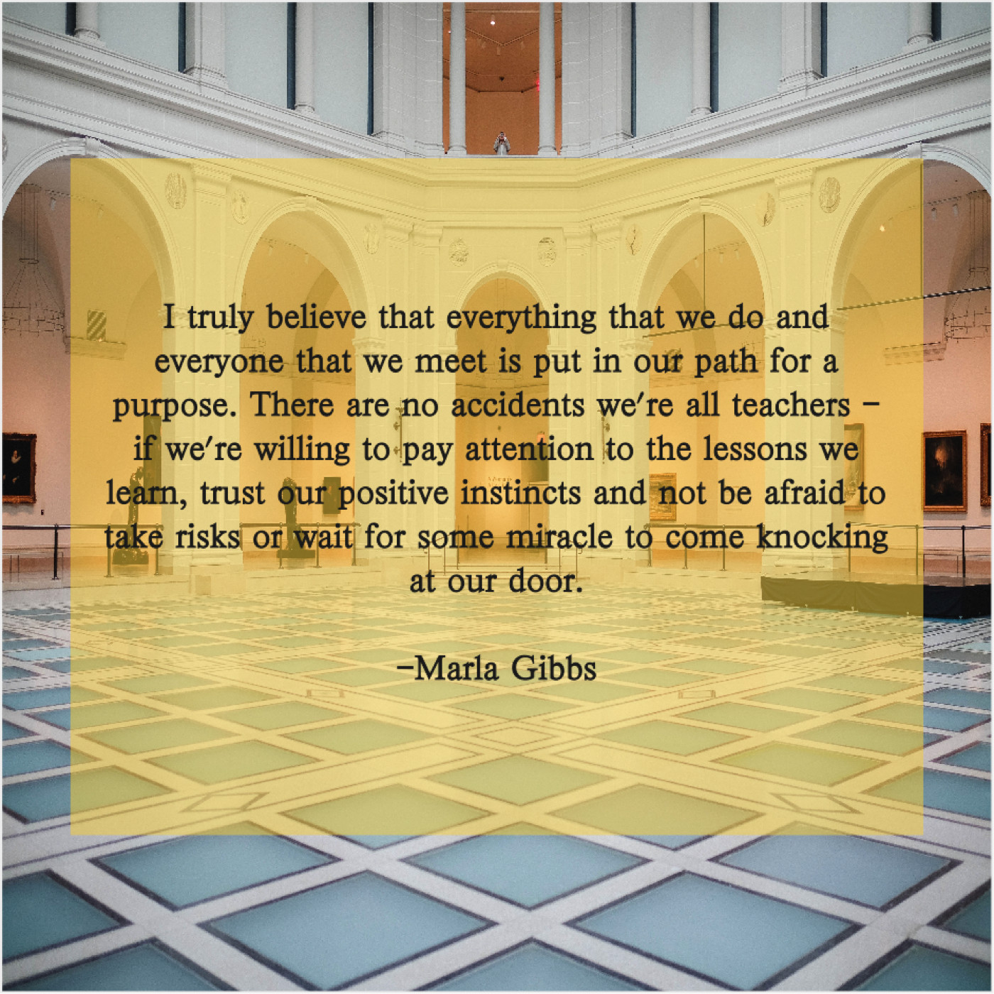 “I truly believe that everything that we do and everyone that we meet is put in our path for a purpose. There are no accidents we’re all teachers – if we’re willing to pay attention to the lessons we learn, trust our positive instincts and not be afraid to take risks or wait for some miracle to come knocking at our door.”