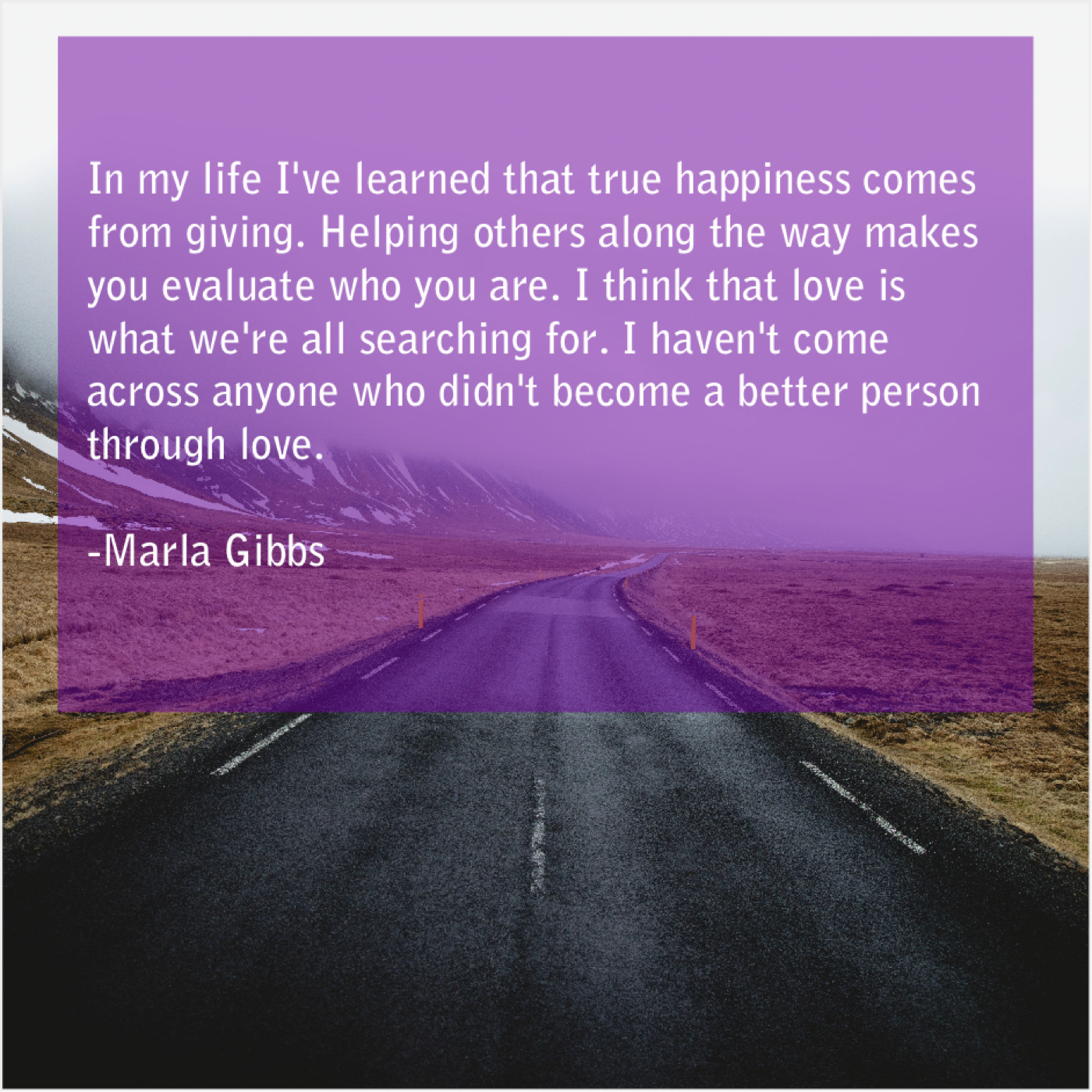 “In my life I’ve learned that true happiness comes from giving. Helping others along the way makes you evaluate who you are. I think that love is what we’re all searching for. I haven’t come across anyone who didn’t become a better person through love.”