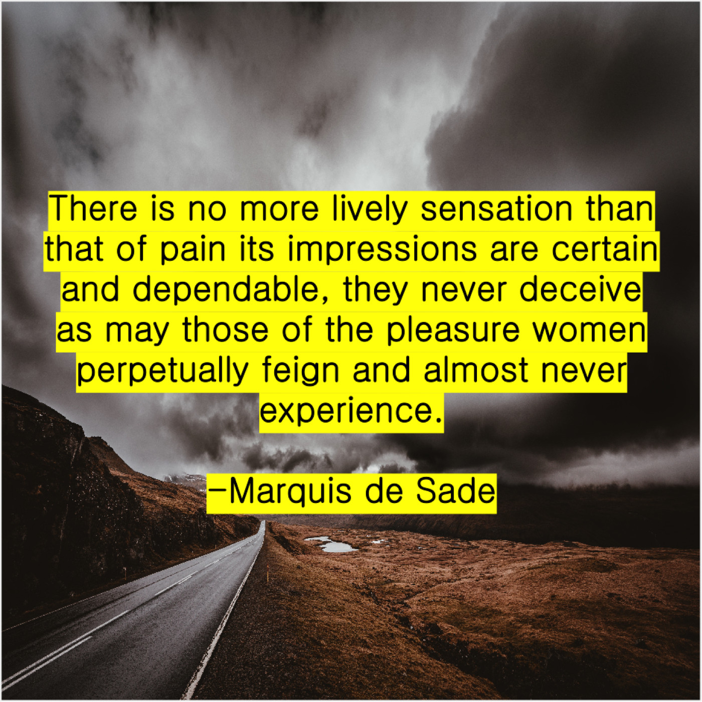 Marquis de Sade Marquis de Sade – There is no more lively… December 17, 2018 admin “There is no more lively sensation than that of pain its impressions are certain and dependable, they never deceive as may those of the pleasure women perpetually feign and almost never experience.”-Marquis de Sade
