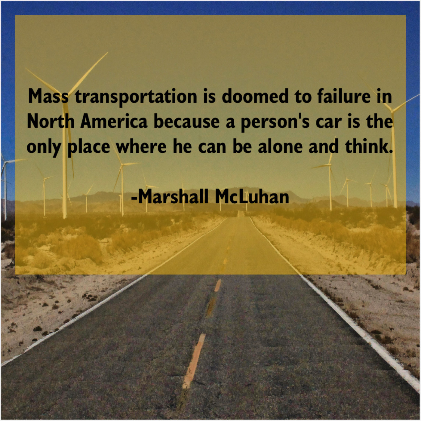 Marshall McLuhan Marshall McLuhan – Mass transportation is doomed to… August 15, 2019 admin “Mass transportation is doomed to failure in North America because a person’s car is the only place where he can be alone and think.”-Marshall McLuhan
