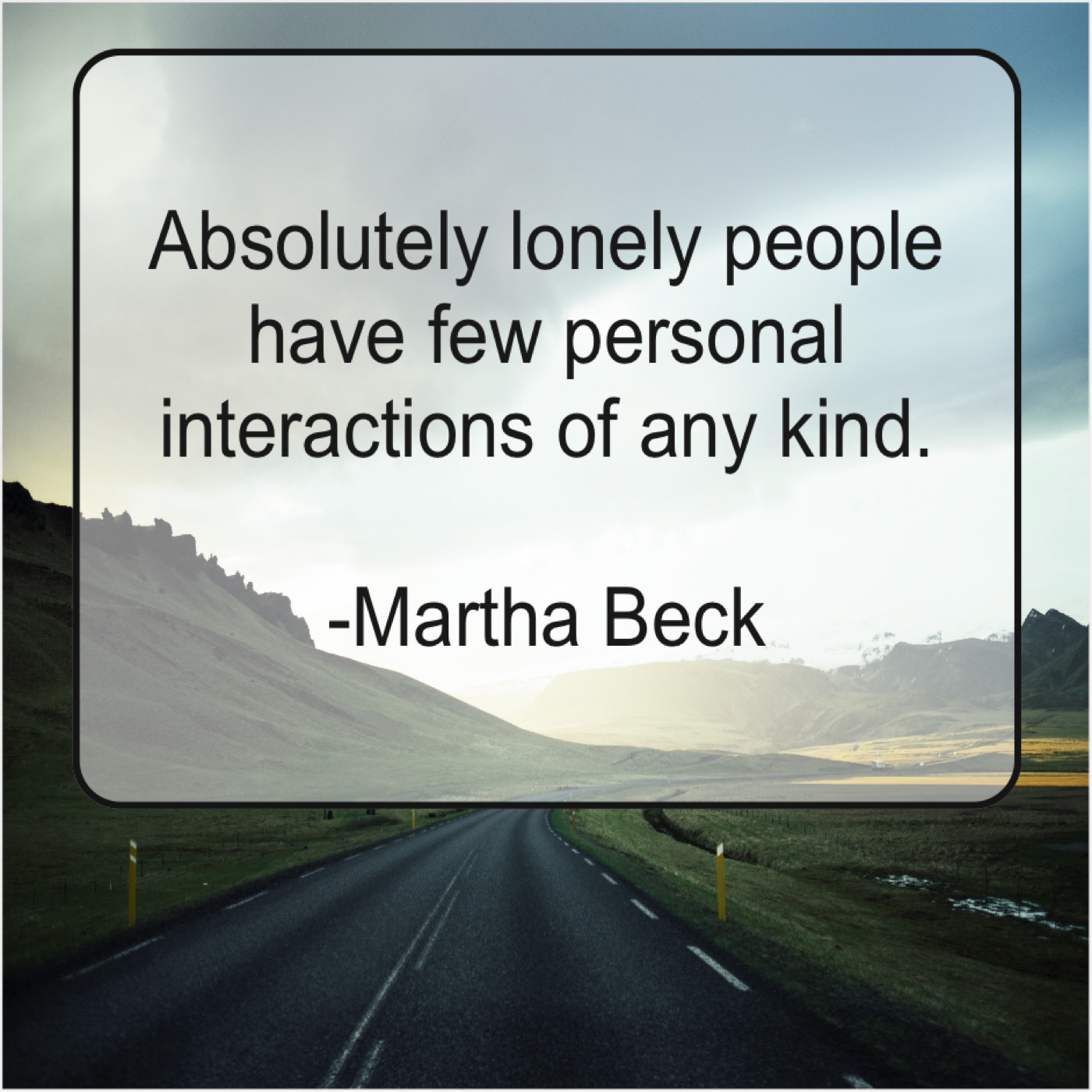Martha Beck Martha Beck – Absolutely lonely people have few… October 19, 2019 admin “Absolutely lonely people have few personal interactions of any kind.”-Martha Beck