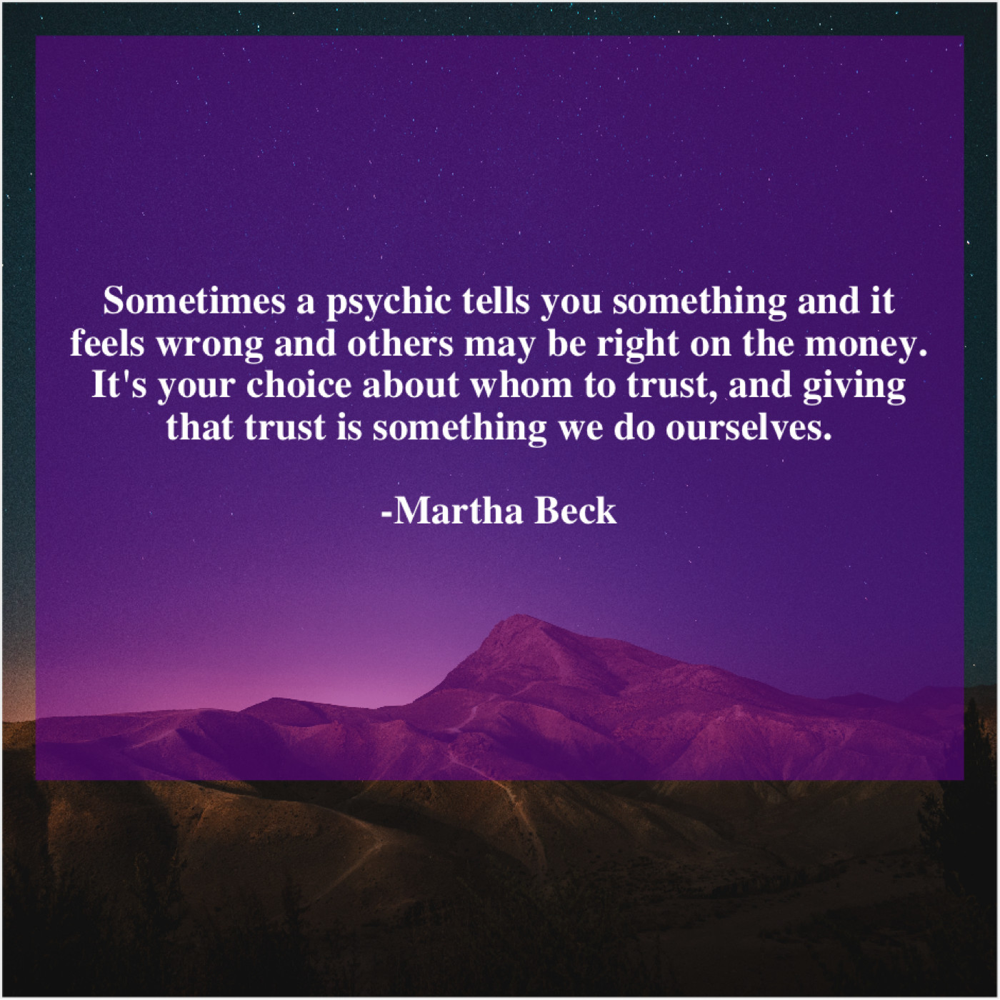 Martha Beck Martha Beck – Sometimes a psychic tells you… November 17, 2018 admin “Sometimes a psychic tells you something and it feels wrong and others may be right on the money. It’s your choice about whom to trust, and giving that trust is something we do ourselves.”-Martha Beck