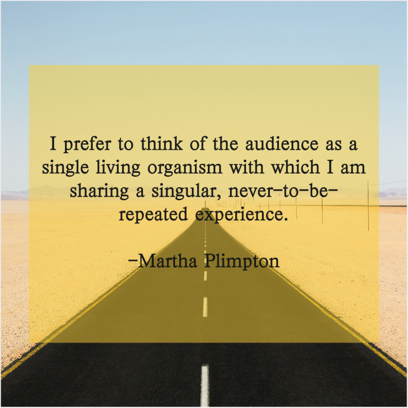 Martha Plimpton Martha Plimpton – I prefer to think of… March 13, 2019 admin “I prefer to think of the audience as a single living organism with which I am sharing a singular, never-to-be-repeated experience.”-Martha Plimpton