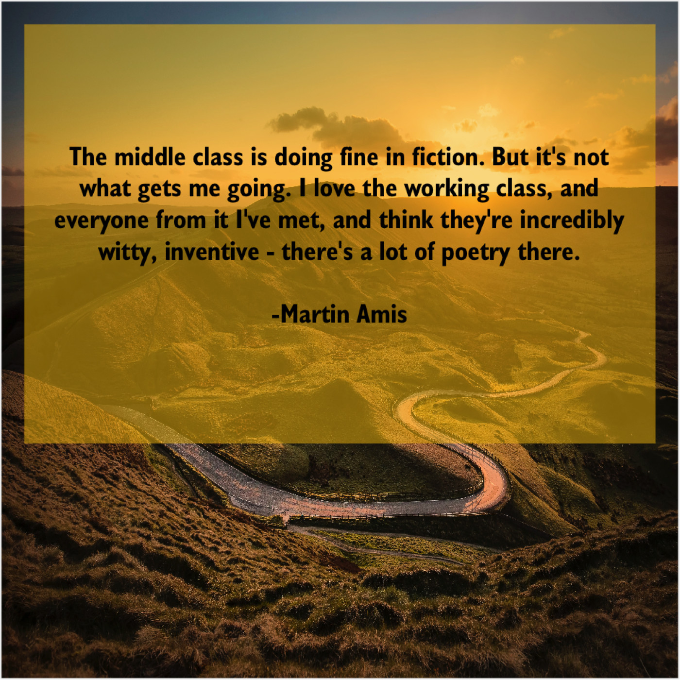 Martin Amis Martin Amis – The middle class is doing… April 9, 2019 admin “The middle class is doing fine in fiction. But it’s not what gets me going. I love the working class, and everyone from it I’ve met, and think they’re incredibly witty, inventive – there’s a lot of poetry there.”-Martin Amis
