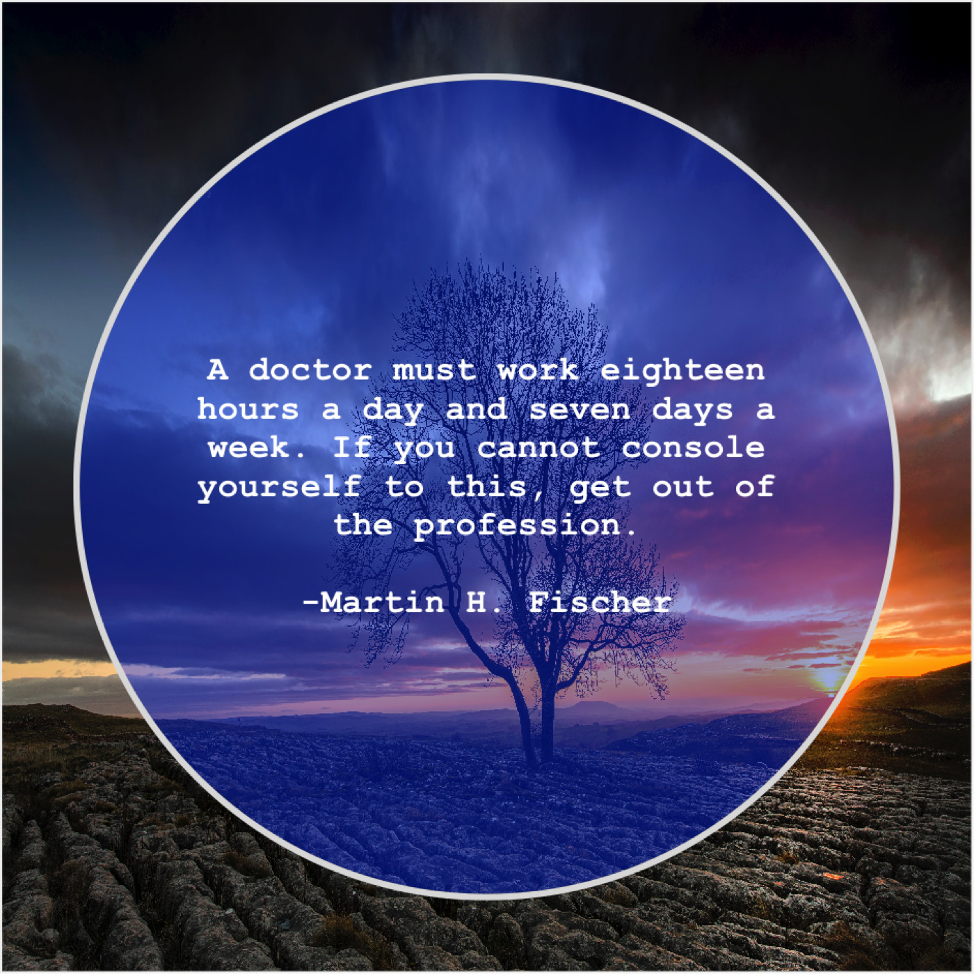 Martin H. Fischer Martin H. Fischer – A doctor must work eighteen… December 16, 2018 admin “A doctor must work eighteen hours a day and seven days a week. If you cannot console yourself to this, get out of the profession.”-Martin H. Fischer