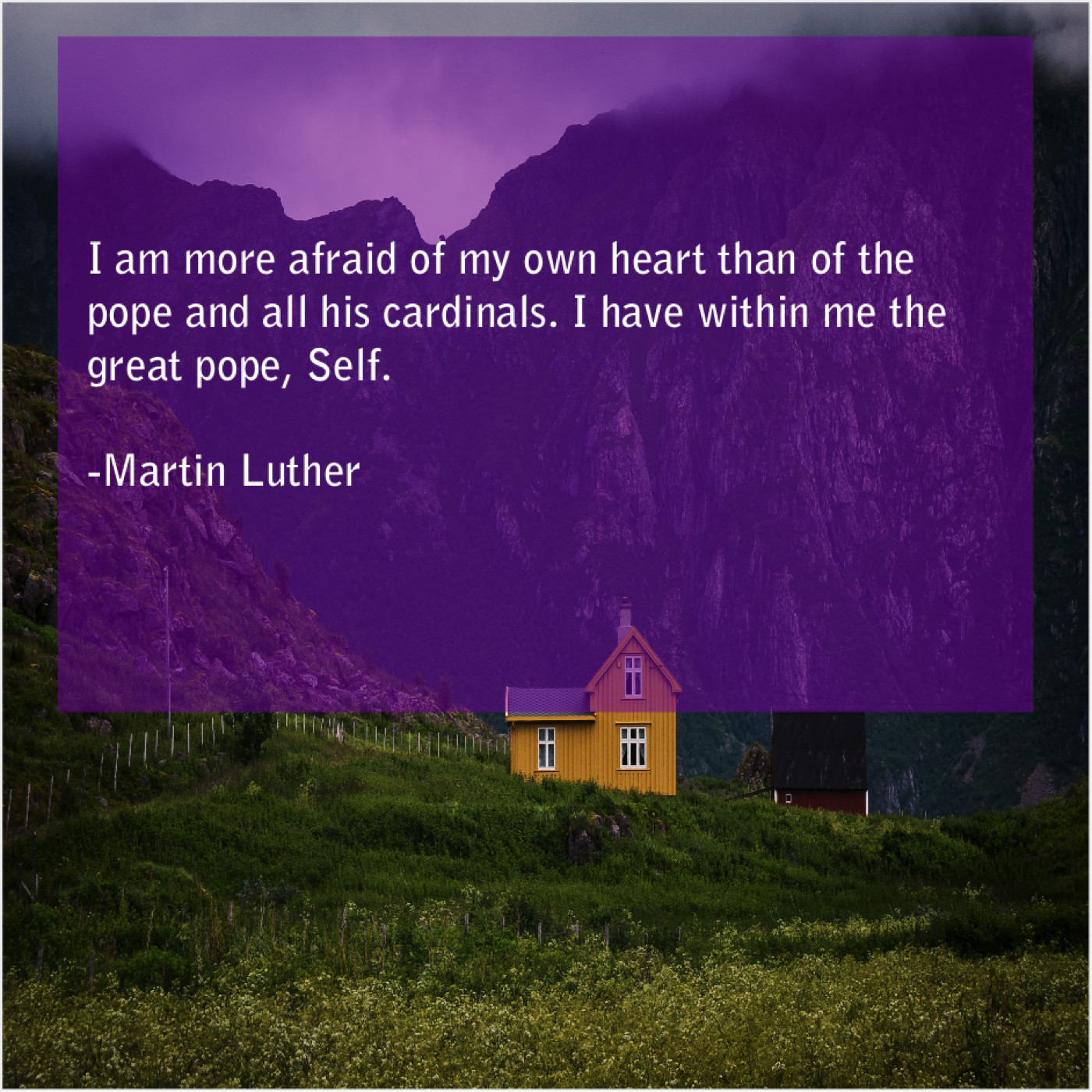 Martin Luther Martin Luther – I am more afraid of… December 21, 2018 admin “I am more afraid of my own heart than of the pope and all his cardinals. I have within me the great pope, Self.”-Martin Luther