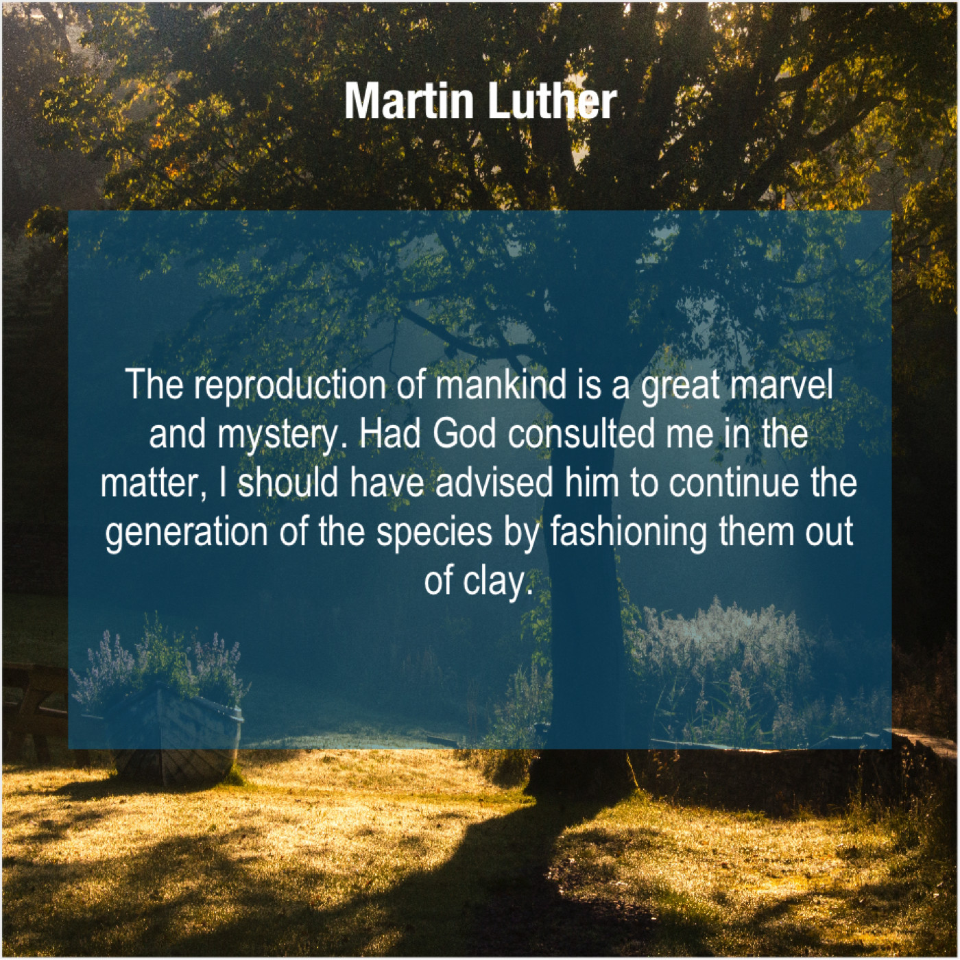Martin Luther Martin Luther – The reproduction of mankind is… April 18, 2019 admin “The reproduction of mankind is a great marvel and mystery. Had God consulted me in the matter, I should have advised him to continue the generation of the species by fashioning them out of clay.”-Martin Luther