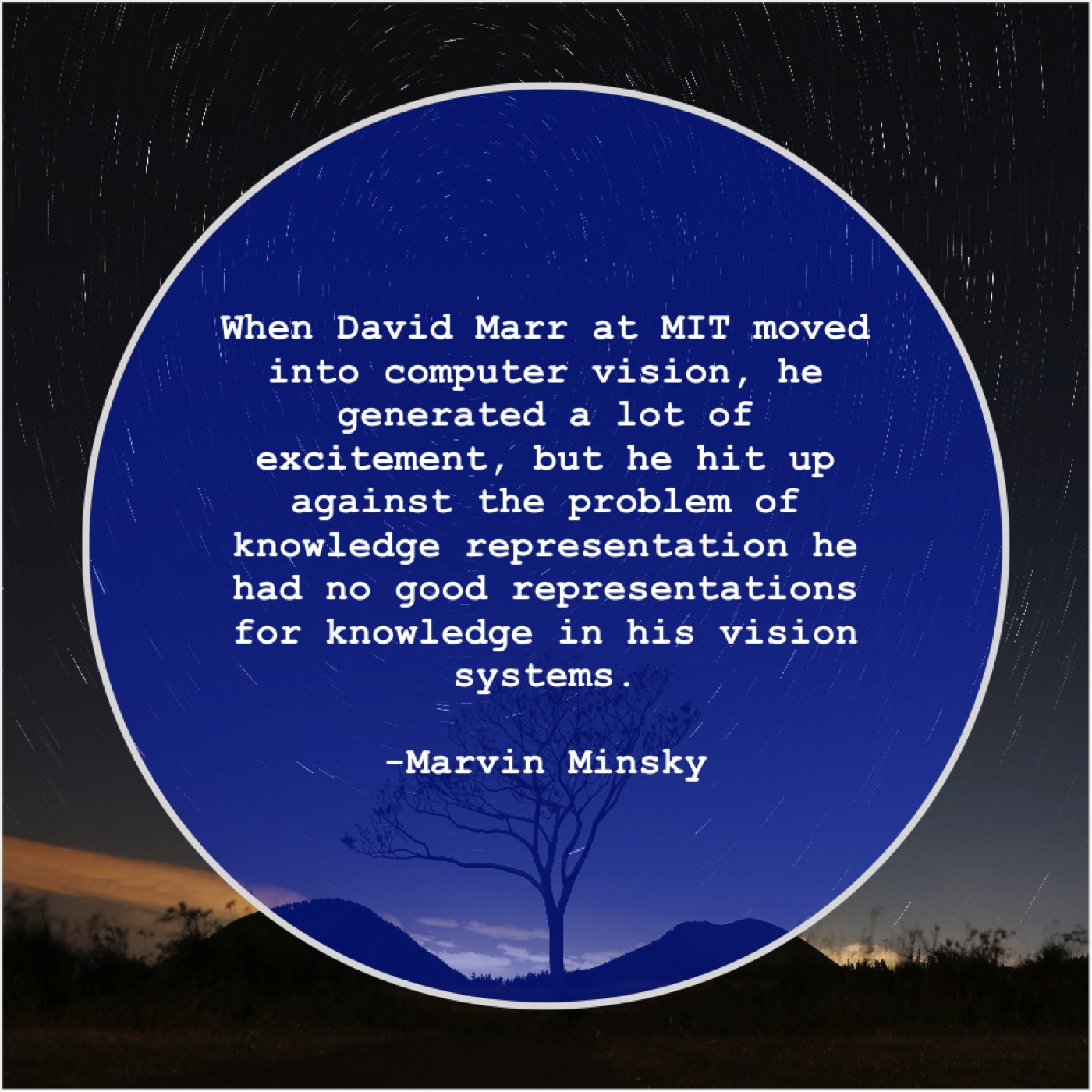 Marvin Minsky Marvin Minsky – When David Marr at MIT… March 11, 2019 admin “When David Marr at MIT moved into computer vision, he generated a lot of excitement, but he hit up against the problem of knowledge representation he had no good representations for knowledge in his vision systems.”-Marvin Minsky
