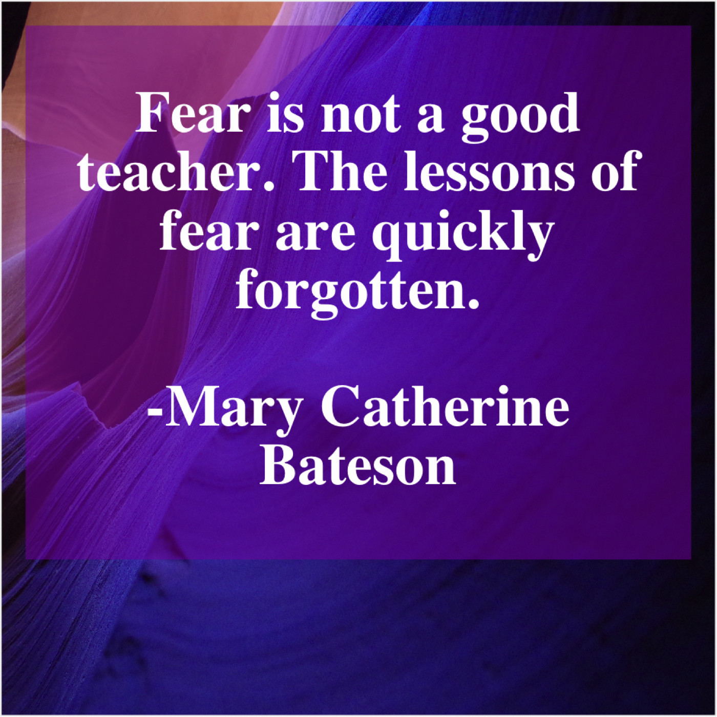 Mary Catherine Bateson Mary Catherine Bateson – Fear is not a good… April 12, 2019 admin “Fear is not a good teacher. The lessons of fear are quickly forgotten.”-Mary Catherine Bateson