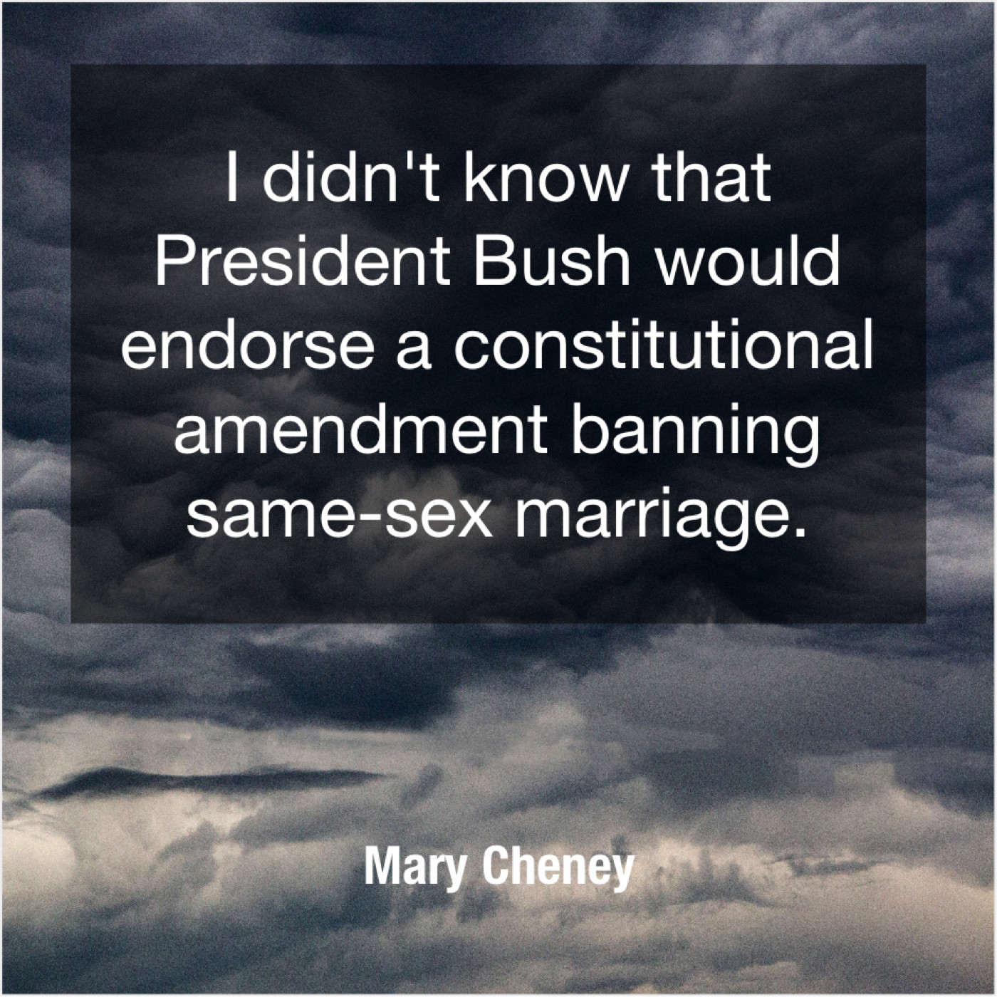 Mary Cheney Mary Cheney – I didn’t know that President… May 23, 2019 admin “I didn’t know that President Bush would endorse a constitutional amendment banning same-sex marriage.”-Mary Cheney