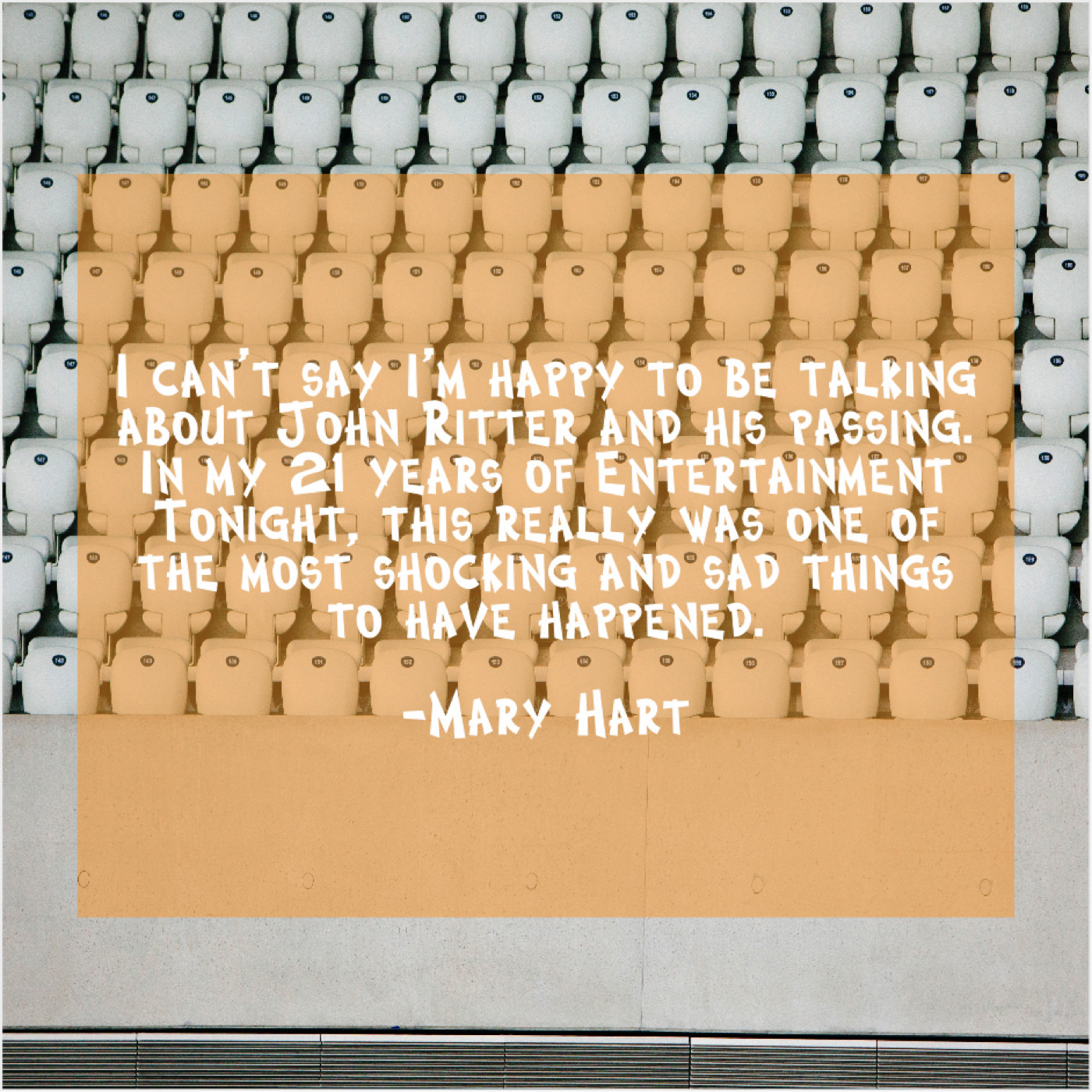 Mary Hart Mary Hart – I can’t say I’m happy… April 1, 2019 admin “I can’t say I’m happy to be talking about John Ritter and his passing. In my 21 years of Entertainment Tonight, this really was one of the most shocking and sad things to have happened.”-Mary Hart