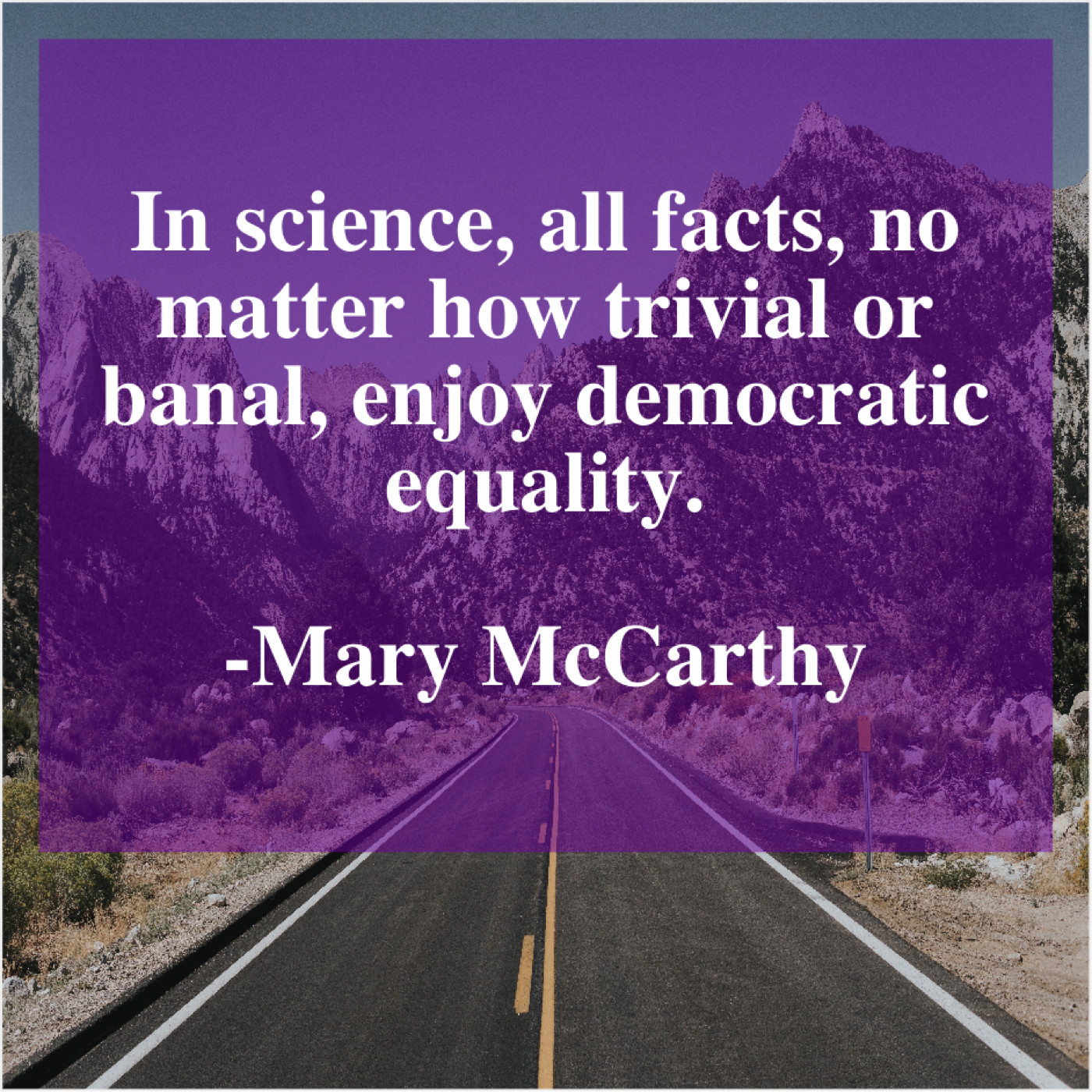 Mary McCarthy Mary McCarthy – In science, all facts, no… August 1, 2019 admin “In science, all facts, no matter how trivial or banal, enjoy democratic equality.”-Mary McCarthy