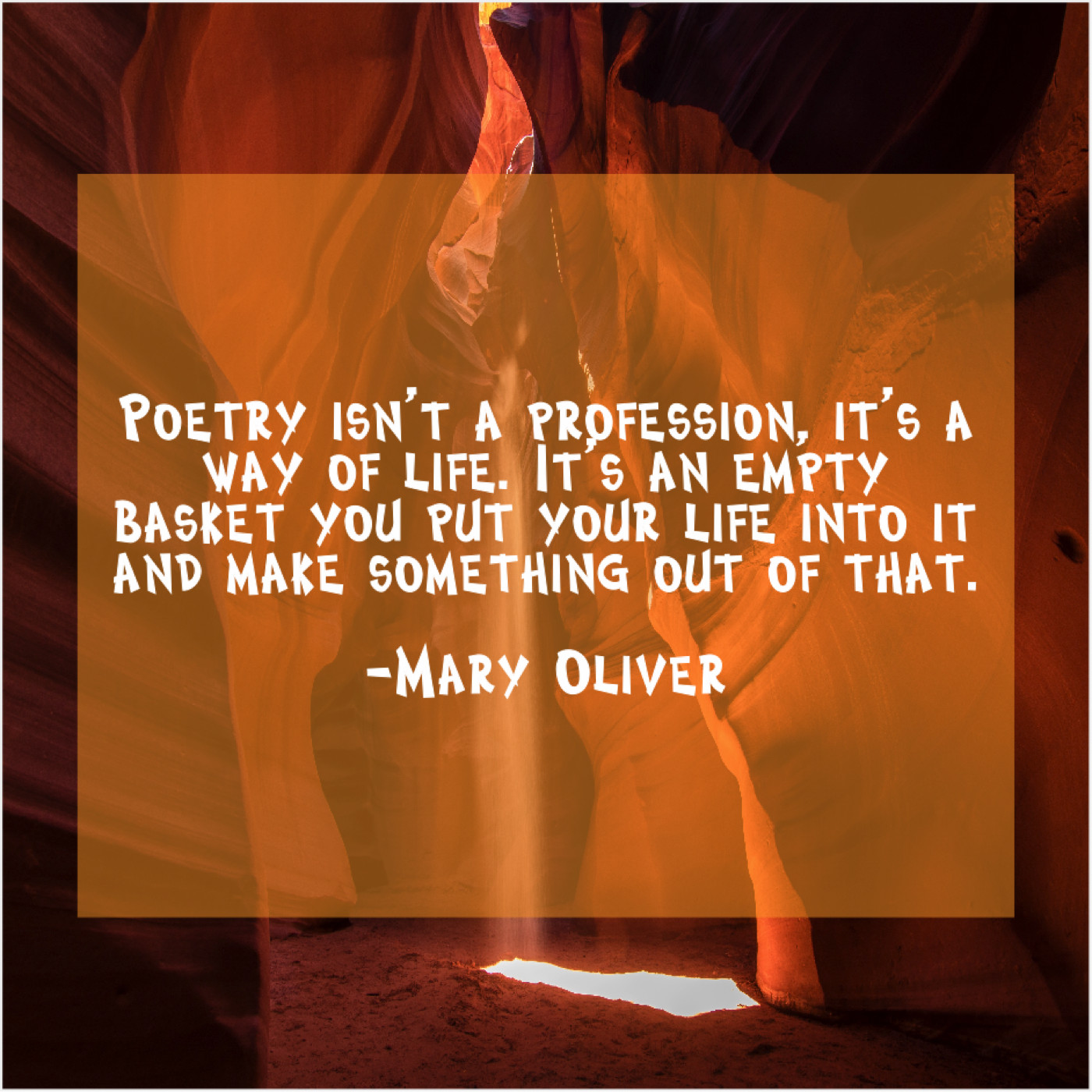 Mary Oliver Mary Oliver – Poetry isn’t a profession, it’s… April 5, 2019 admin “Poetry isn’t a profession, it’s a way of life. It’s an empty basket you put your life into it and make something out of that.”-Mary Oliver