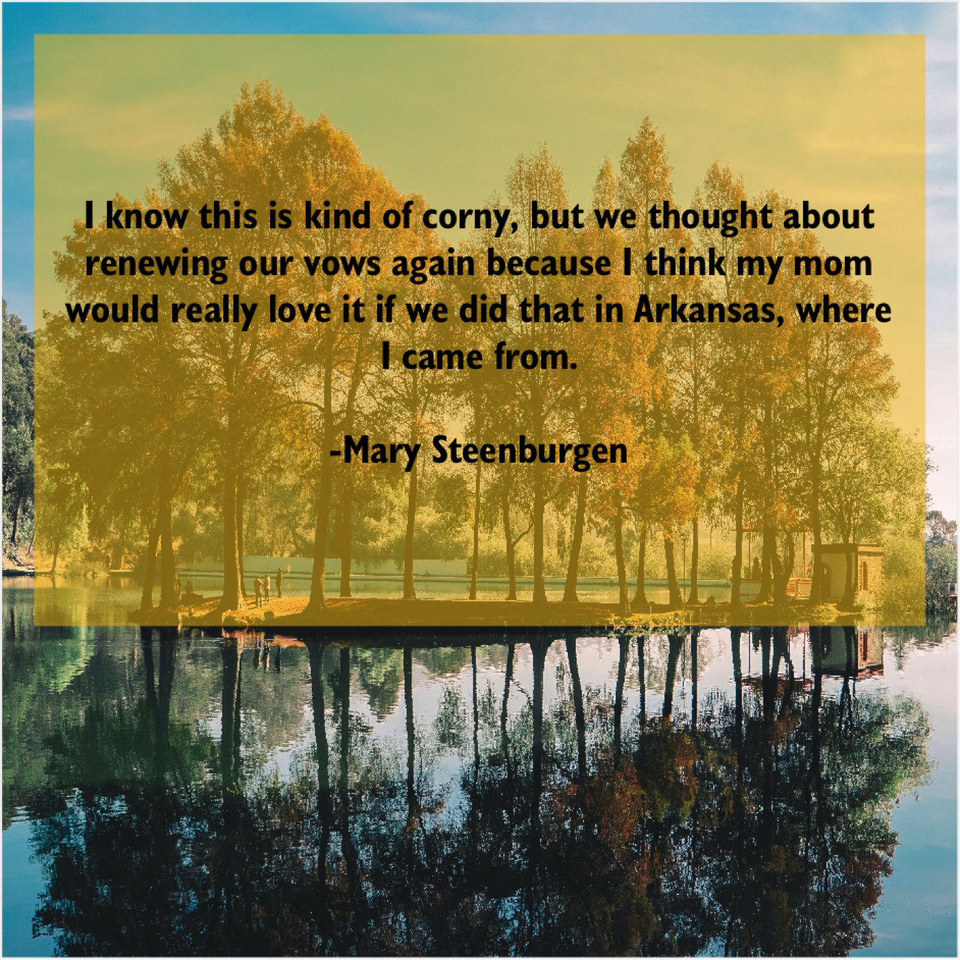 Mary Steenburgen Mary Steenburgen – I know this is kind… February 16, 2019 admin “I know this is kind of corny, but we thought about renewing our vows again because I think my mom would really love it if we did that in Arkansas, where I came from.”-Mary Steenburgen