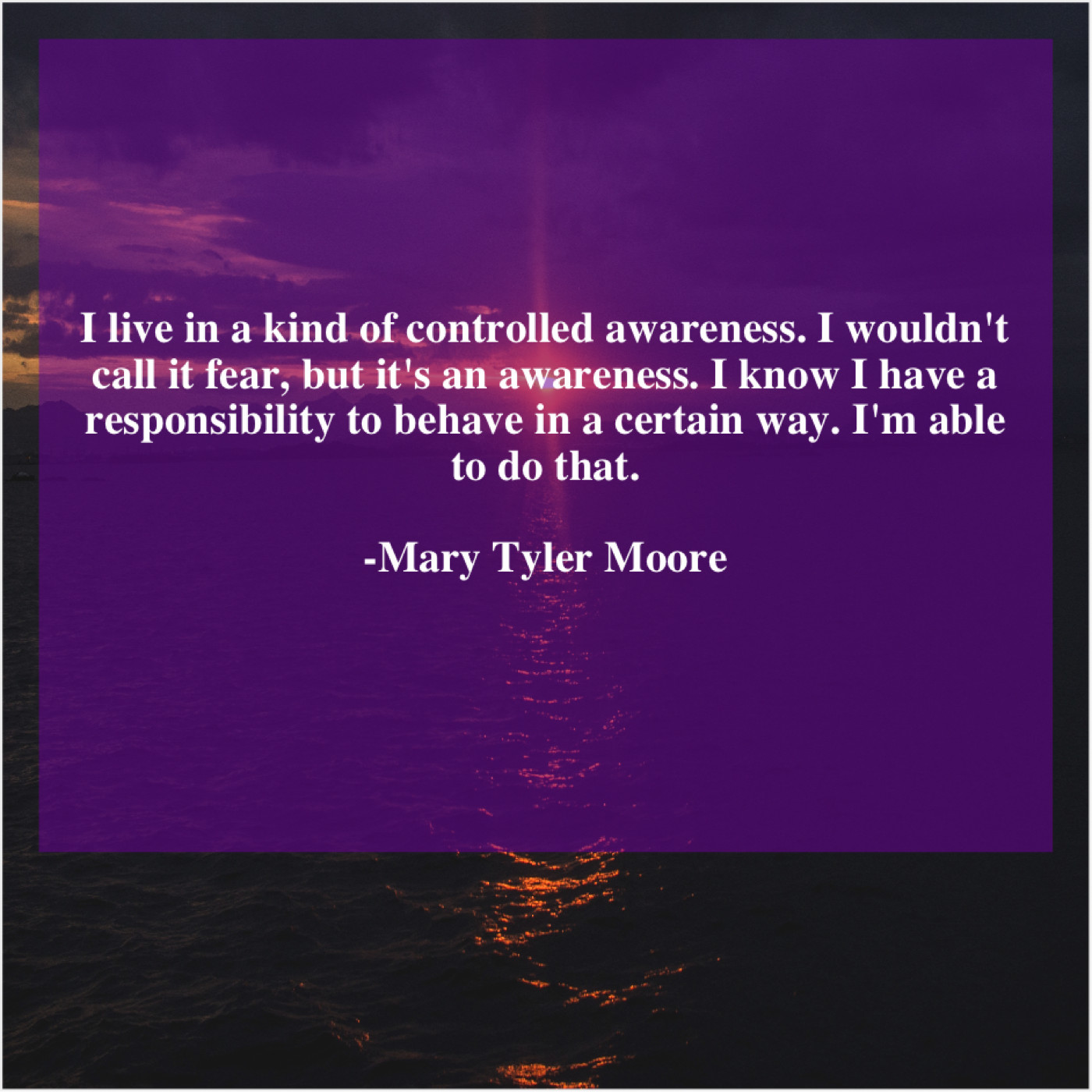 Mary Tyler Moore Mary Tyler Moore – I live in a kind… June 13, 2019 admin “I live in a kind of controlled awareness. I wouldn’t call it fear, but it’s an awareness. I know I have a responsibility to behave in a certain way. I’m able to do that.”-Mary Tyler Moore