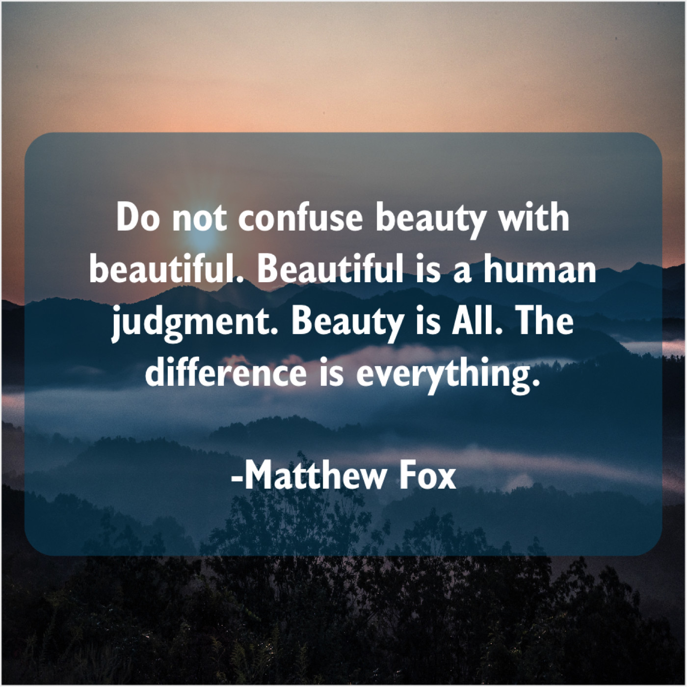 Matthew Fox Matthew Fox – Do not confuse beauty with… September 30, 2019 admin “Do not confuse beauty with beautiful. Beautiful is a human judgment. Beauty is All. The difference is everything.”-Matthew Fox
