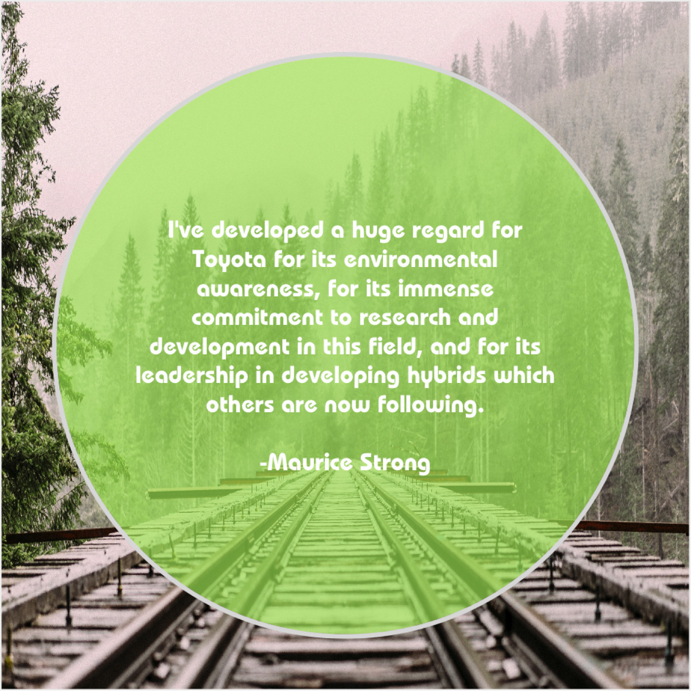 Maurice Strong Maurice Strong – I’ve developed a huge regard… July 29, 2019 admin “I’ve developed a huge regard for Toyota for its environmental awareness, for its immense commitment to research and development in this field, and for its leadership in developing hybrids which others are now following.”-Maurice Strong