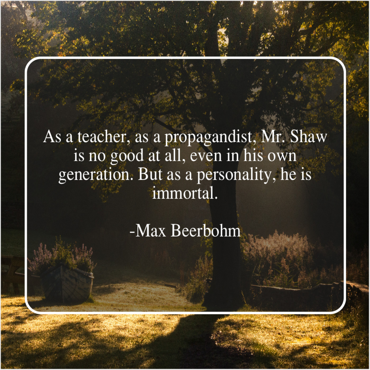 Max Beerbohm Max Beerbohm – As a teacher, as a… November 2, 2018 admin “As a teacher, as a propagandist, Mr. Shaw is no good at all, even in his own generation. But as a personality, he is immortal.”-Max Beerbohm