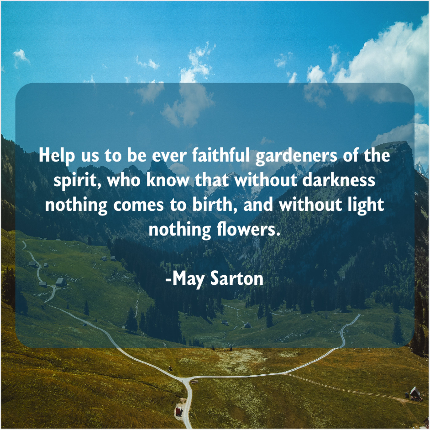 May Sarton May Sarton – Help us to be ever… April 20, 2019 admin “Help us to be ever faithful gardeners of the spirit, who know that without darkness nothing comes to birth, and without light nothing flowers.”-May Sarton