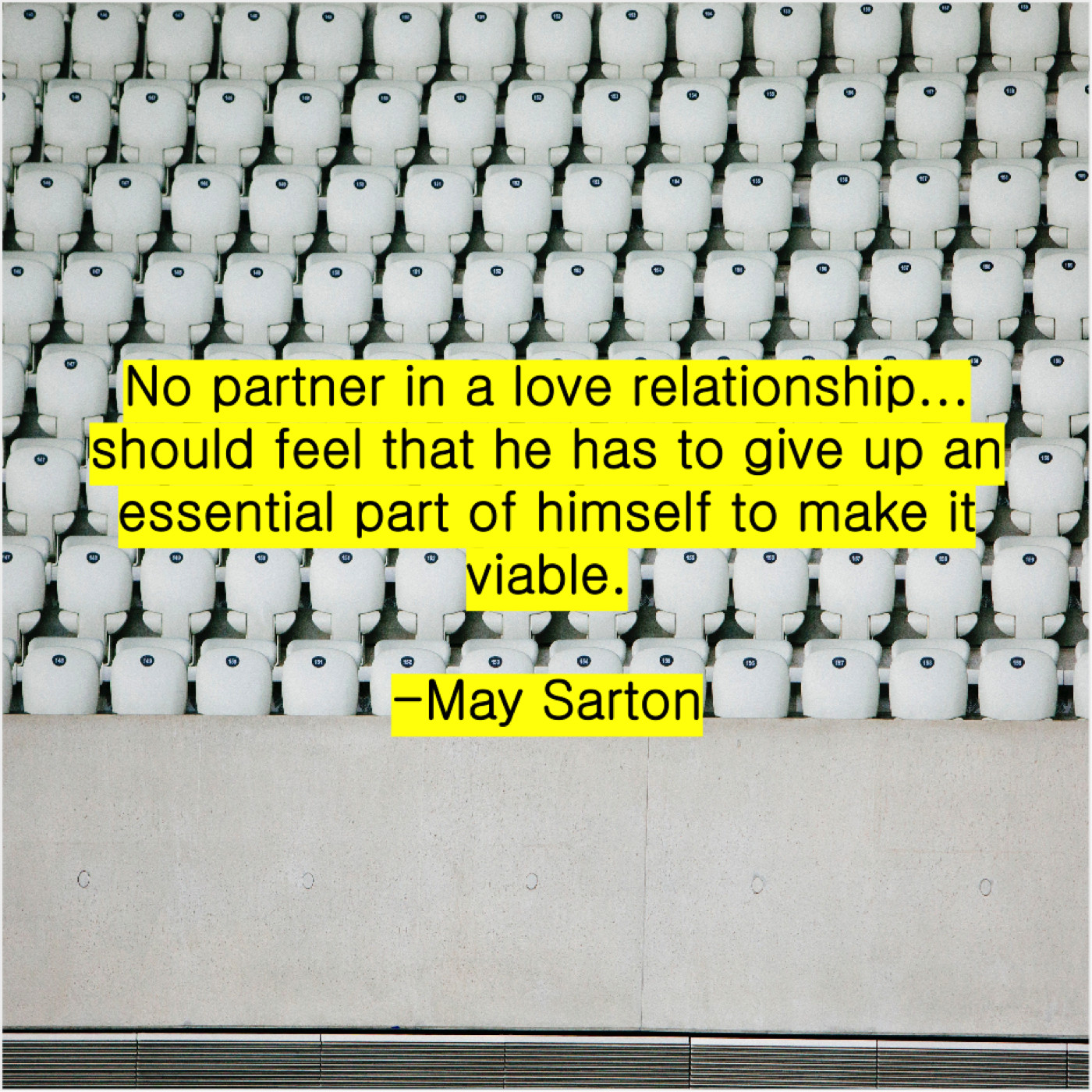 May Sarton May Sarton – No partner in a love… March 26, 2019 admin “No partner in a love relationship… should feel that he has to give up an essential part of himself to make it viable.”-May Sarton