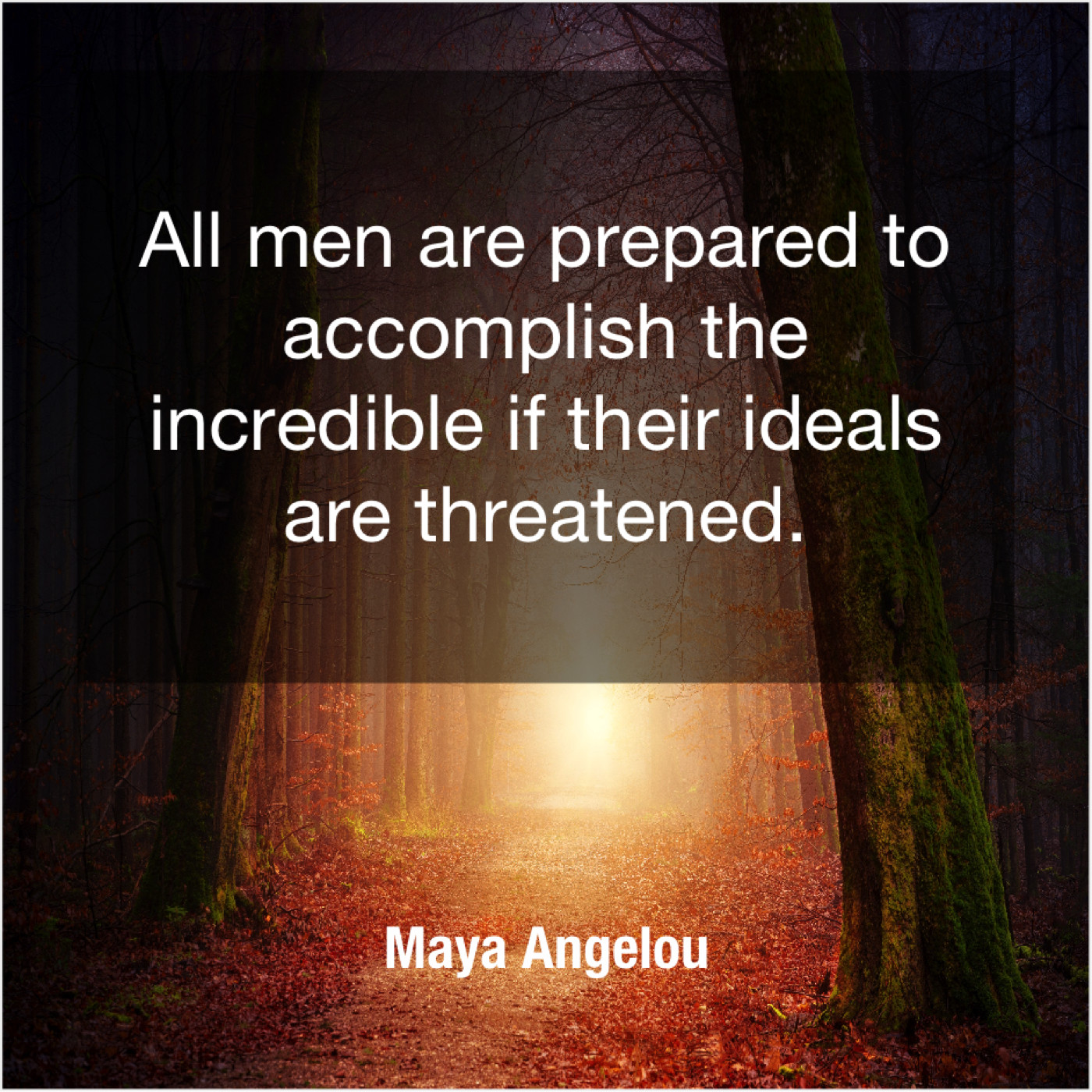 Maya Angelou Maya Angelou – All men are prepared to… February 6, 2019 admin “All men are prepared to accomplish the incredible if their ideals are threatened.”-Maya Angelou
