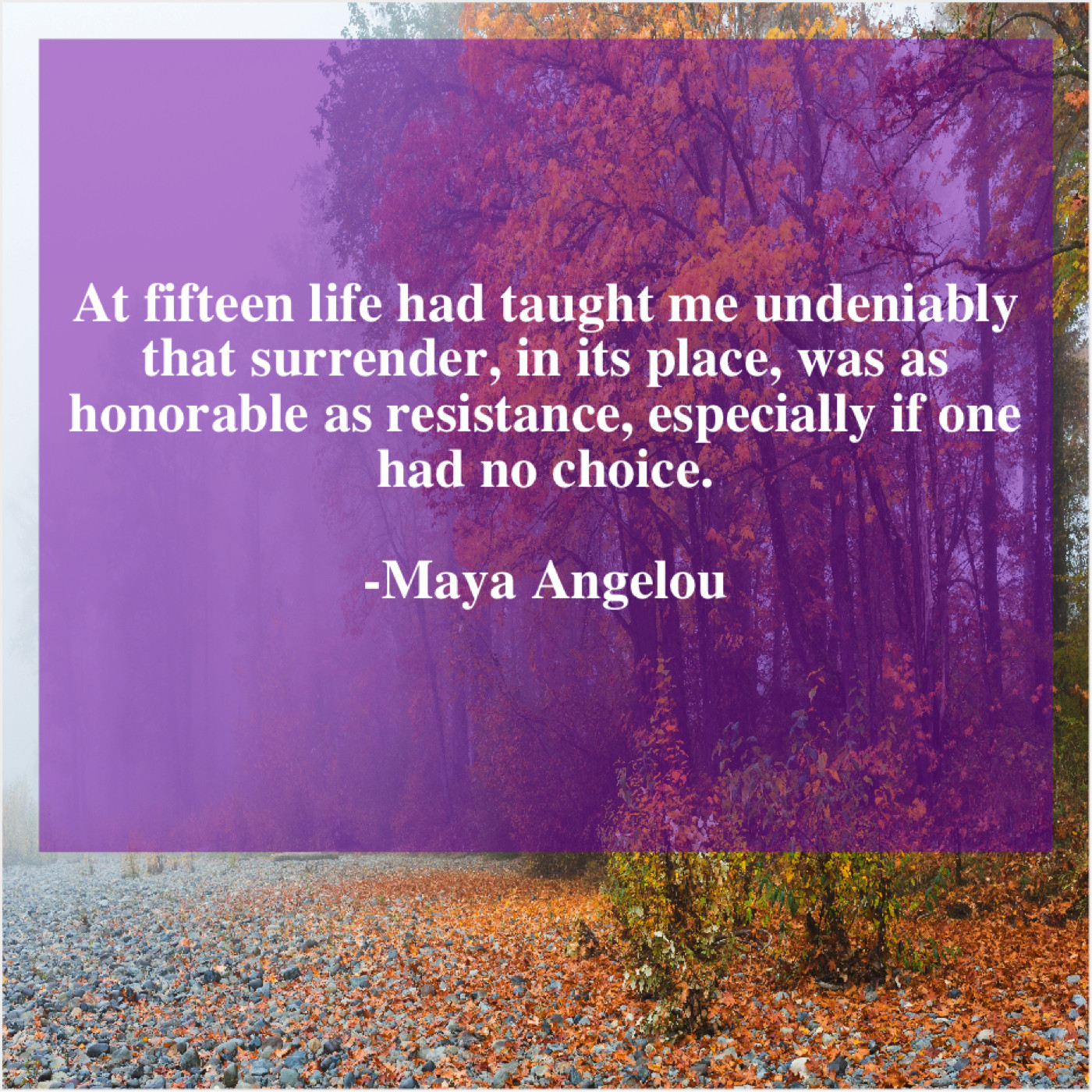 Maya Angelou Maya Angelou – At fifteen life had taught… September 22, 2019 admin “At fifteen life had taught me undeniably that surrender, in its place, was as honorable as resistance, especially if one had no choice.”-Maya Angelou