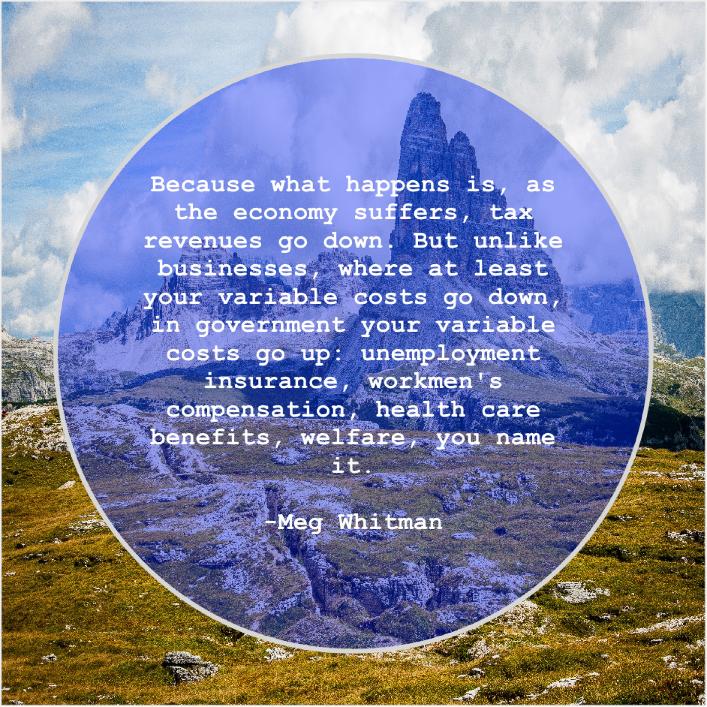 “Because what happens is, as the economy suffers, tax revenues go down. But unlike businesses, where at least your variable costs go down, in government your variable costs go up: unemployment insurance, workmen’s compensation, health care benefits, welfare, you name it.”