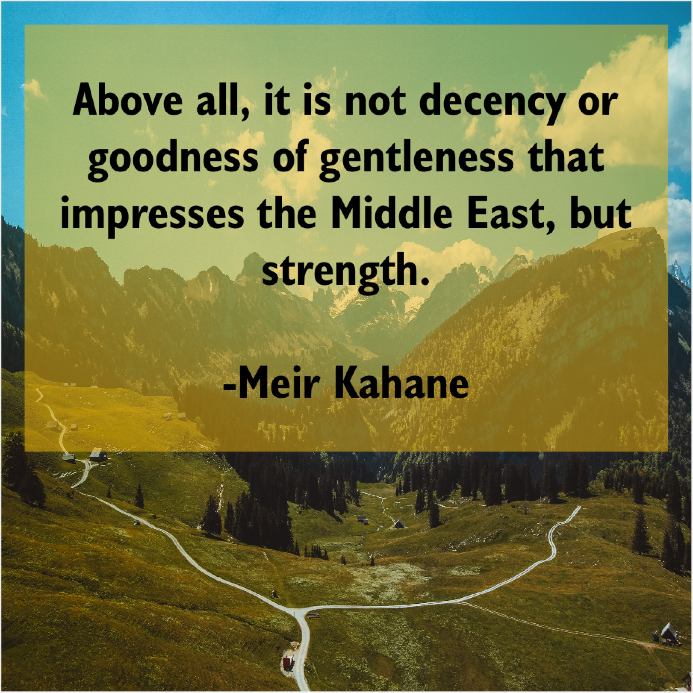 Meir Kahane Meir Kahane – Above all, it is not… September 17, 2019 admin “Above all, it is not decency or goodness of gentleness that impresses the Middle East, but strength.”-Meir Kahane
