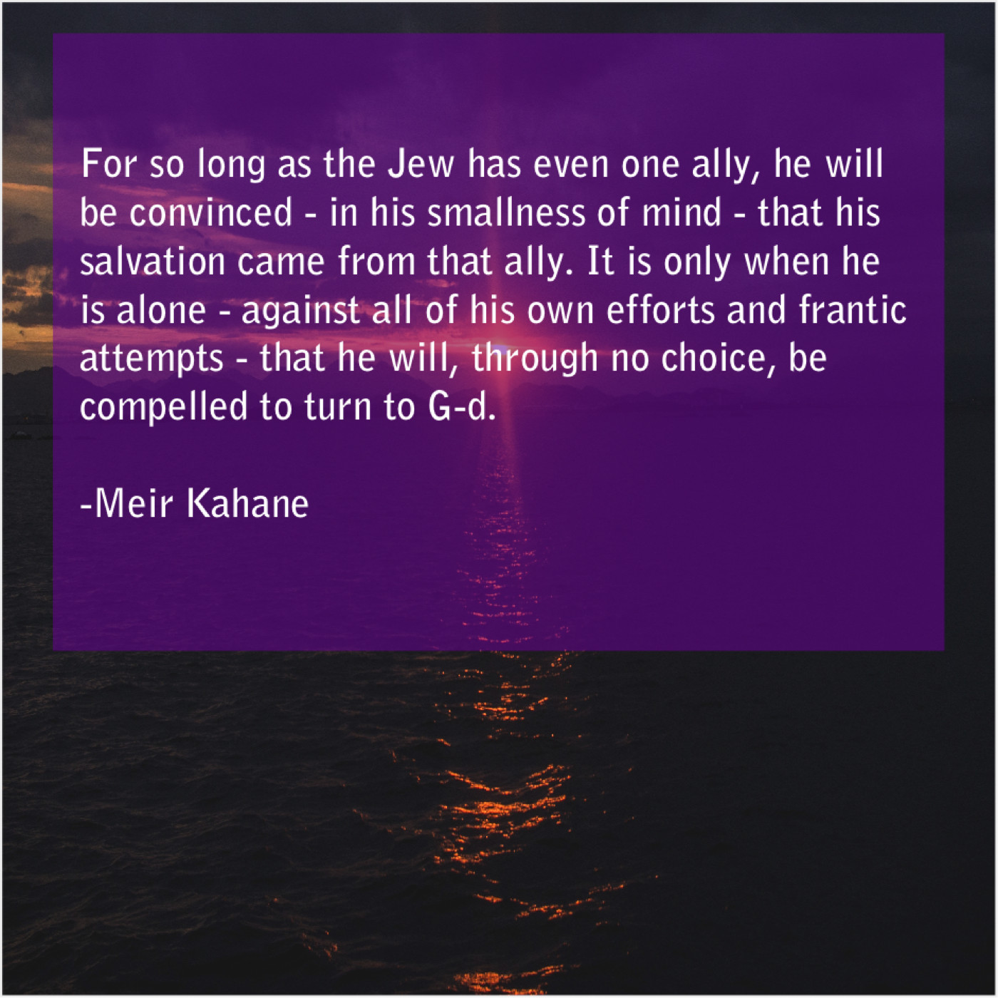 “For so long as the Jew has even one ally, he will be convinced – in his smallness of mind – that his salvation came from that ally. It is only when he is alone – against all of his own efforts and frantic attempts – that he will, through no choice, be compelled to turn to G-d.”
