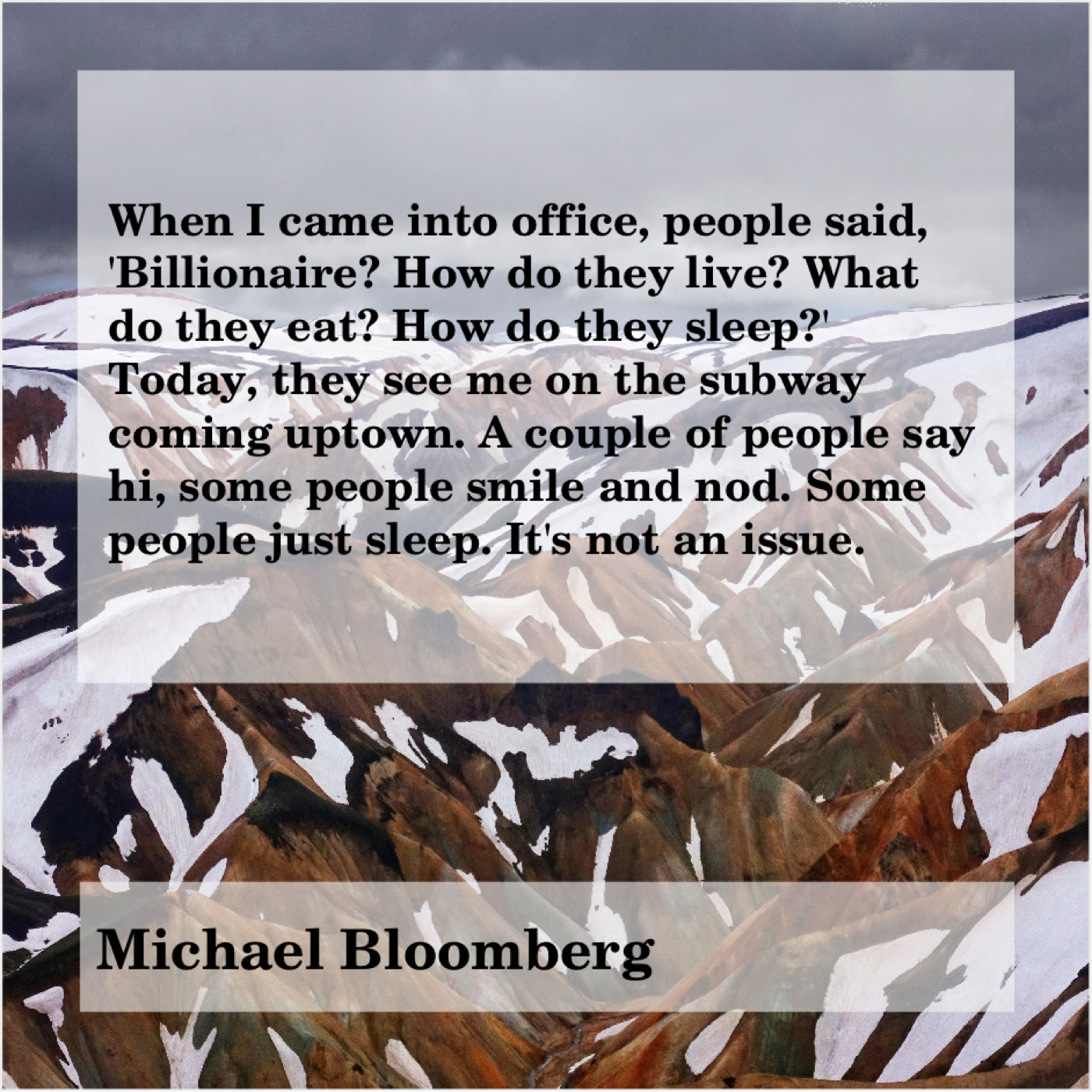 “When I came into office, people said, ‘Billionaire? How do they live? What do they eat? How do they sleep?’ Today, they see me on the subway coming uptown. A couple of people say hi, some people smile and nod. Some people just sleep. It’s not an issue.”