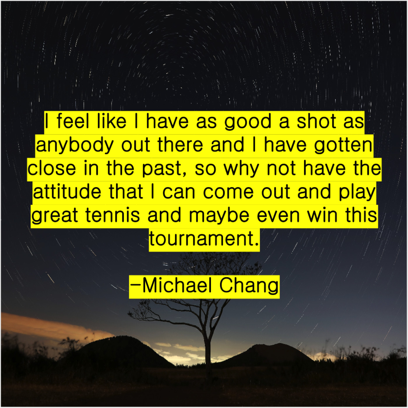 Michael Chang Michael Chang – I feel like I have… August 1, 2019 admin “I feel like I have as good a shot as anybody out there and I have gotten close in the past, so why not have the attitude that I can come out and play great tennis and maybe even win this tournament.”-Michael Chang