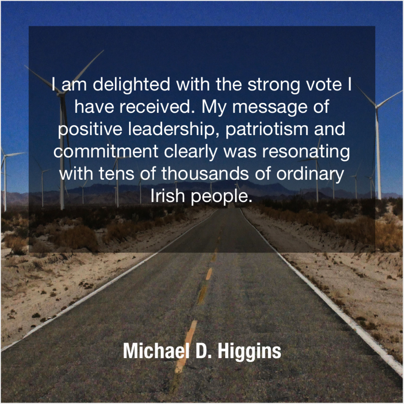 Michael D. Higgins Michael D. Higgins – I am delighted with the… December 23, 2018 admin “I am delighted with the strong vote I have received. My message of positive leadership, patriotism and commitment clearly was resonating with tens of thousands of ordinary Irish people.”-Michael D. Higgins