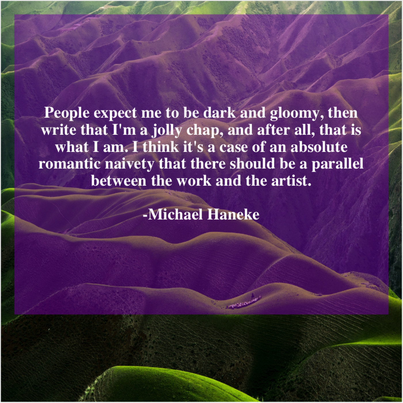 Michael Haneke Michael Haneke – People expect me to be… June 13, 2019 admin “People expect me to be dark and gloomy, then write that I’m a jolly chap, and after all, that is what I am. I think it’s a case of an absolute romantic naivety that there should be a parallel between the work and the artist.”-Michael Haneke