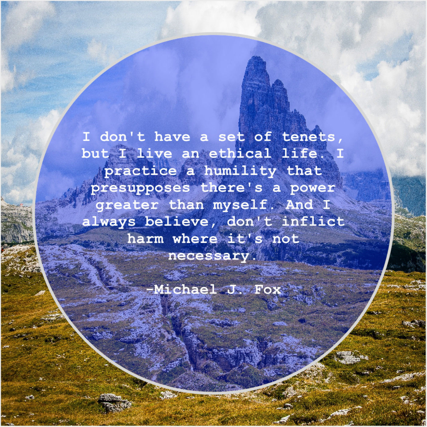 Michael J. Fox Michael J. Fox – I don’t have a set… September 10, 2019 admin “I don’t have a set of tenets, but I live an ethical life. I practice a humility that presupposes there’s a power greater than myself. And I always believe, don’t inflict harm where it’s not necessary.”-Michael J. Fox