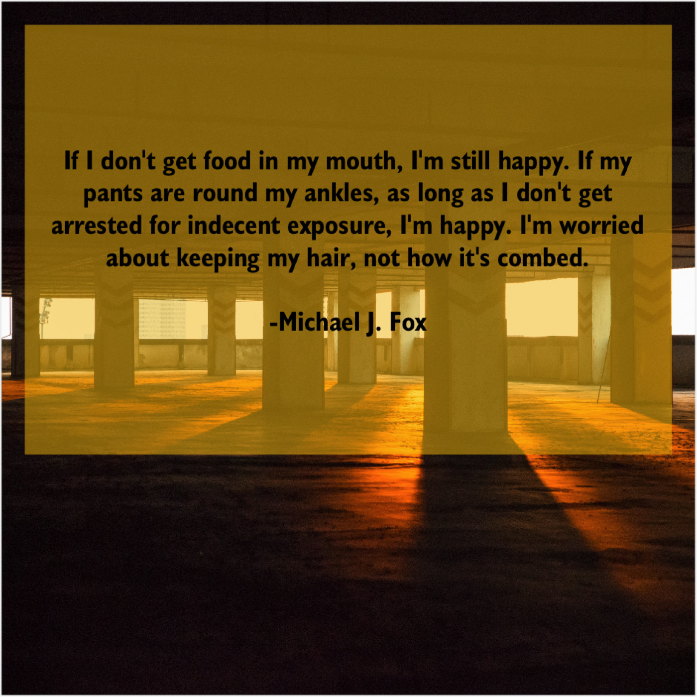 Michael J. Fox Michael J. Fox – If I don’t get food… April 19, 2019 admin “If I don’t get food in my mouth, I’m still happy. If my pants are round my ankles, as long as I don’t get arrested for indecent exposure, I’m happy. I’m worried about keeping my hair, not how it’s combed.”-Michael J. Fox