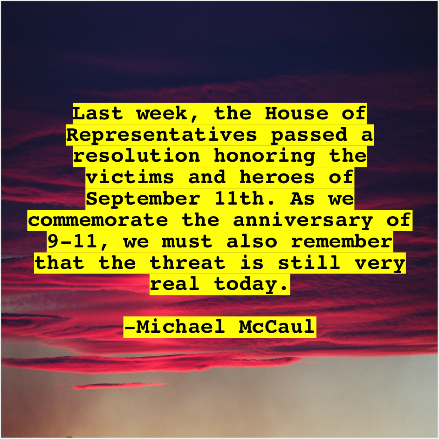 Michael McCaul Michael McCaul – Last week, the House of… August 23, 2019 admin “Last week, the House of Representatives passed a resolution honoring the victims and heroes of September 11th. As we commemorate the anniversary of 9-11, we must also remember that the threat is still very real today.”-Michael McCaul