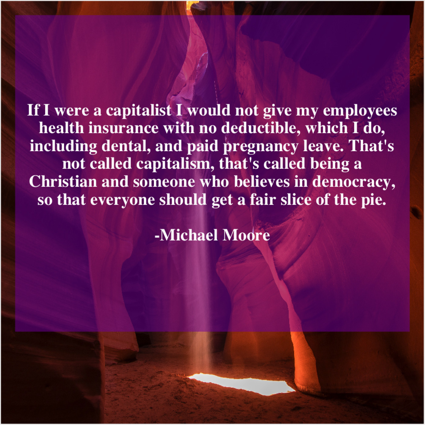“If I were a capitalist I would not give my employees health insurance with no deductible, which I do, including dental, and paid pregnancy leave. That’s not called capitalism, that’s called being a Christian and someone who believes in democracy, so that everyone should get a fair slice of the pie.”
