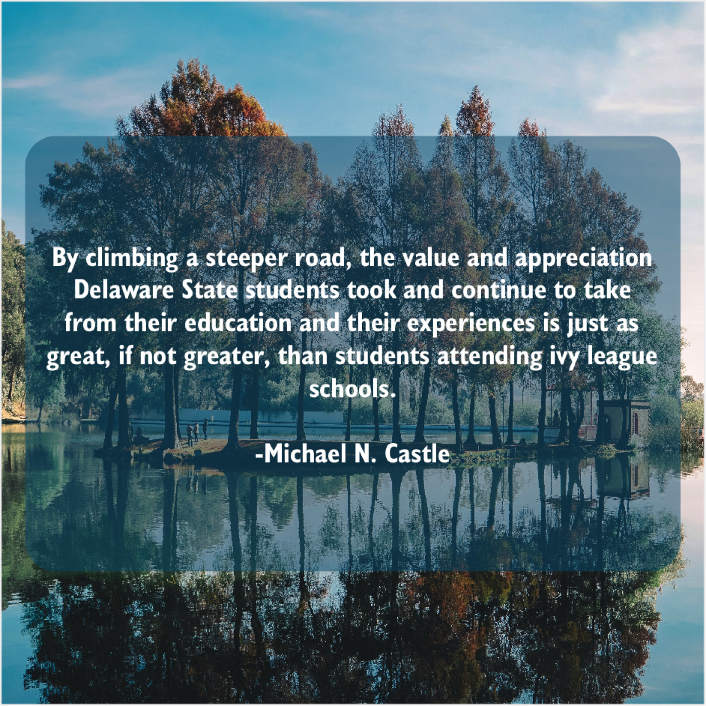 Michael N. Castle Michael N. Castle – By climbing a steeper road… February 21, 2019 admin “By climbing a steeper road, the value and appreciation Delaware State students took and continue to take from their education and their experiences is just as great, if not greater, than students attending ivy league schools.”-Michael N. Castle