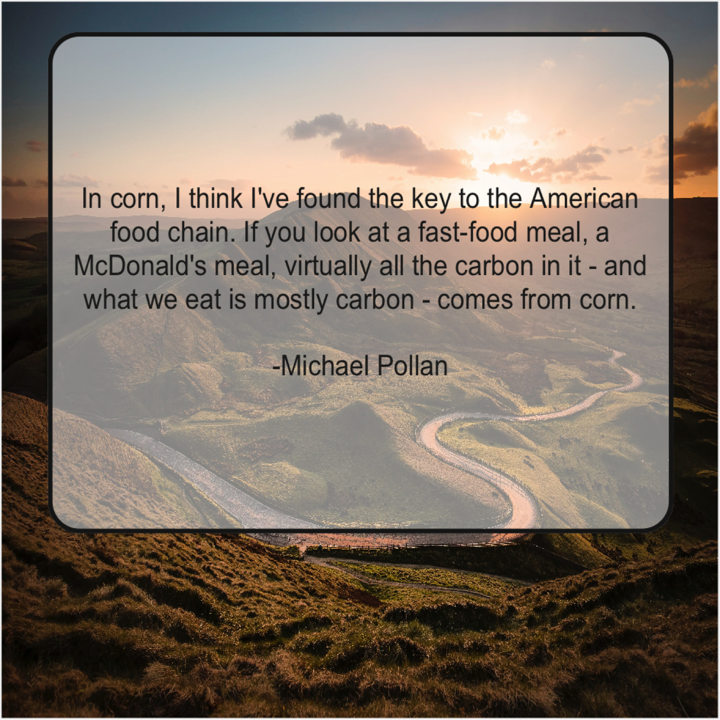 Michael Pollan Michael Pollan – In corn, I think I’ve… February 11, 2019 admin “In corn, I think I’ve found the key to the American food chain. If you look at a fast-food meal, a McDonald’s meal, virtually all the carbon in it – and what we eat is mostly carbon – comes from corn.”-Michael Pollan