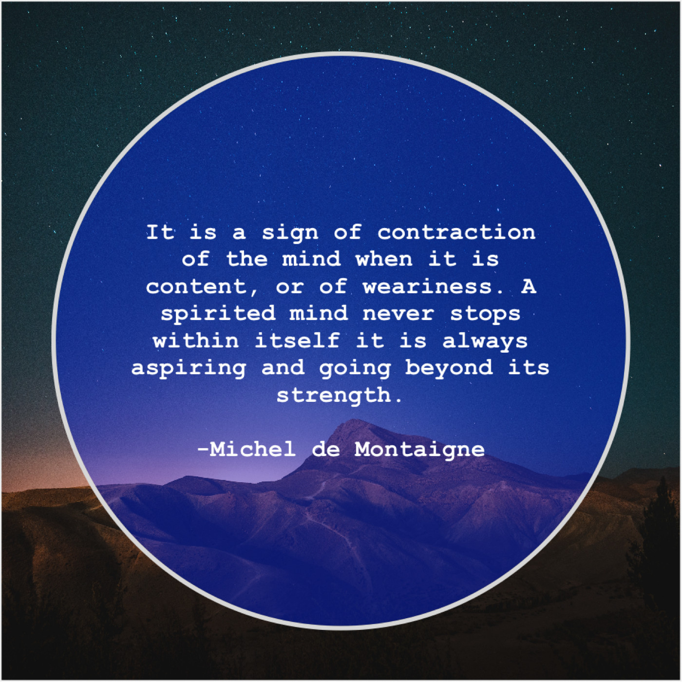 Michel de Montaigne Michel de Montaigne – It is a sign of… May 28, 2019 admin “It is a sign of contraction of the mind when it is content, or of weariness. A spirited mind never stops within itself it is always aspiring and going beyond its strength.”-Michel de Montaigne