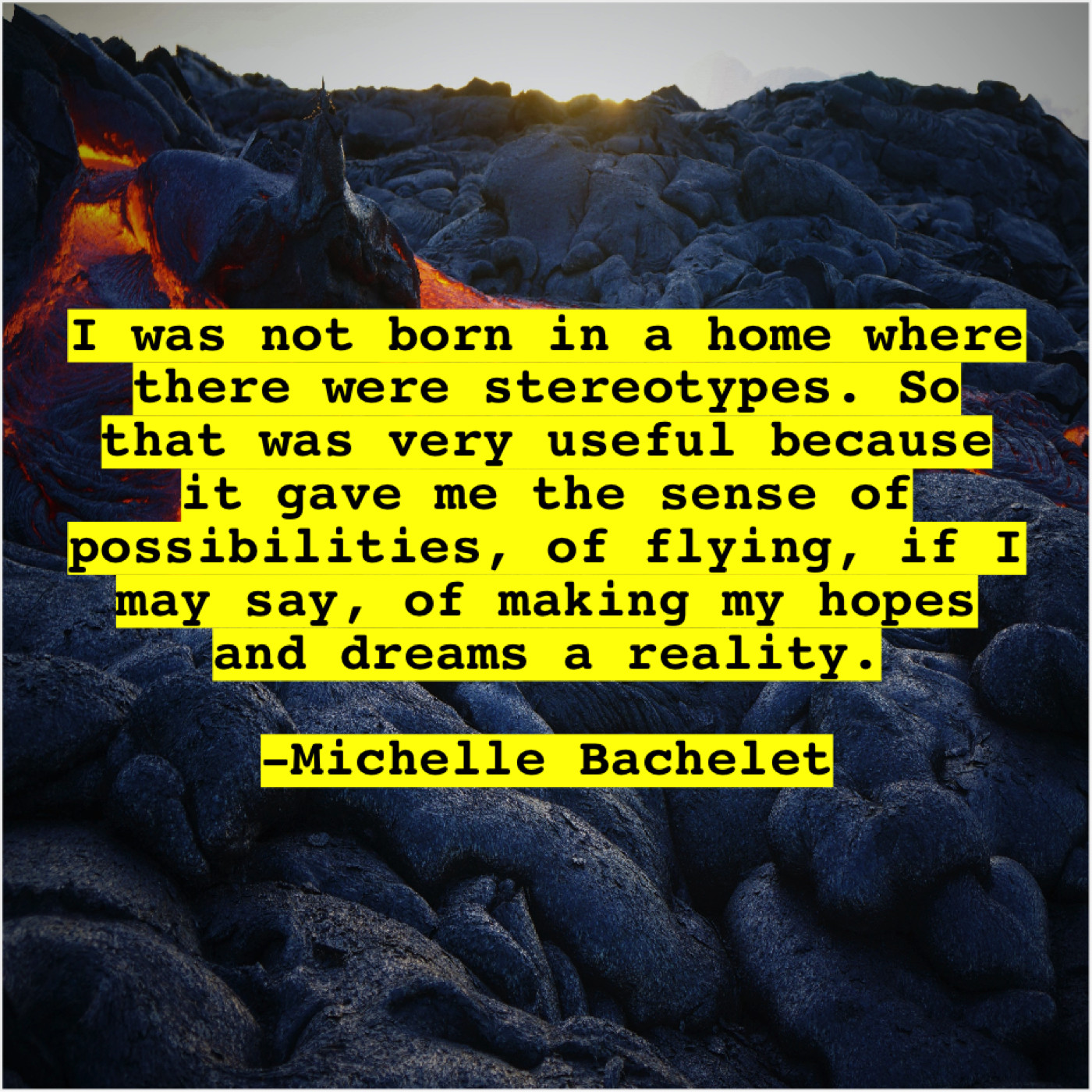 Michelle Bachelet Michelle Bachelet – I was not born in… April 12, 2019 admin “I was not born in a home where there were stereotypes. So that was very useful because it gave me the sense of possibilities, of flying, if I may say, of making my hopes and dreams a reality.”-Michelle Bachelet