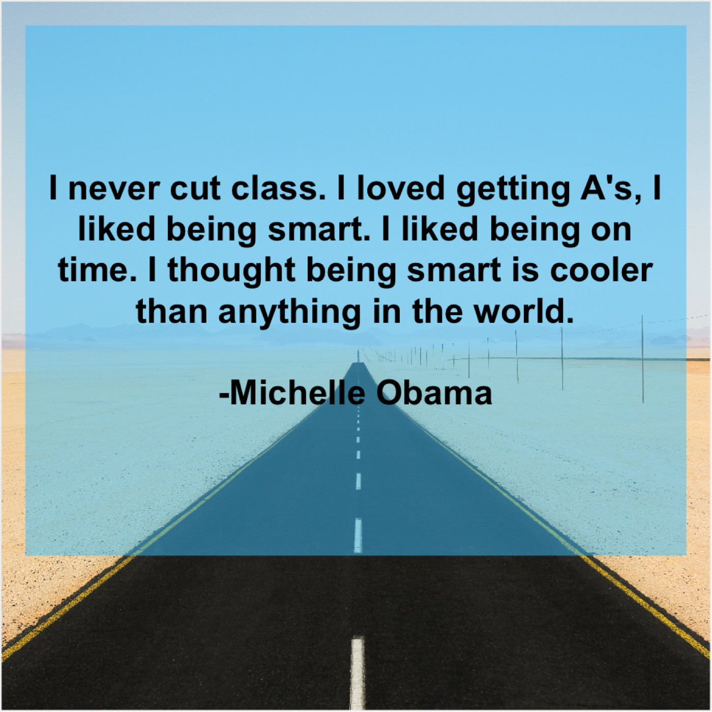 Michelle Obama Michelle Obama – I never cut class. I… December 19, 2018 admin “I never cut class. I loved getting A’s, I liked being smart. I liked being on time. I thought being smart is cooler than anything in the world.”-Michelle Obama