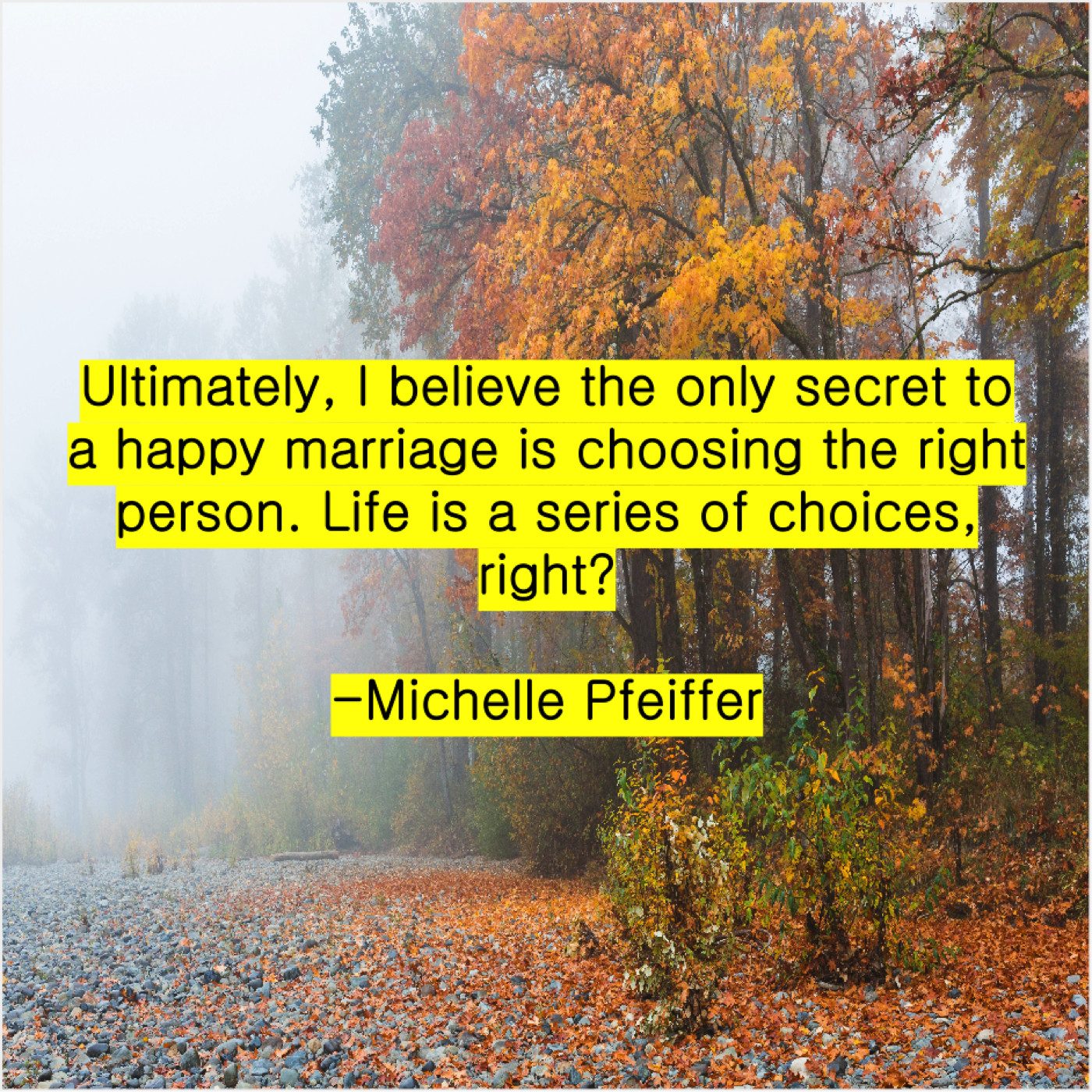 Michelle Pfeiffer Michelle Pfeiffer – Ultimately, I believe the only… September 16, 2019 admin “Ultimately, I believe the only secret to a happy marriage is choosing the right person. Life is a series of choices, right?”-Michelle Pfeiffer