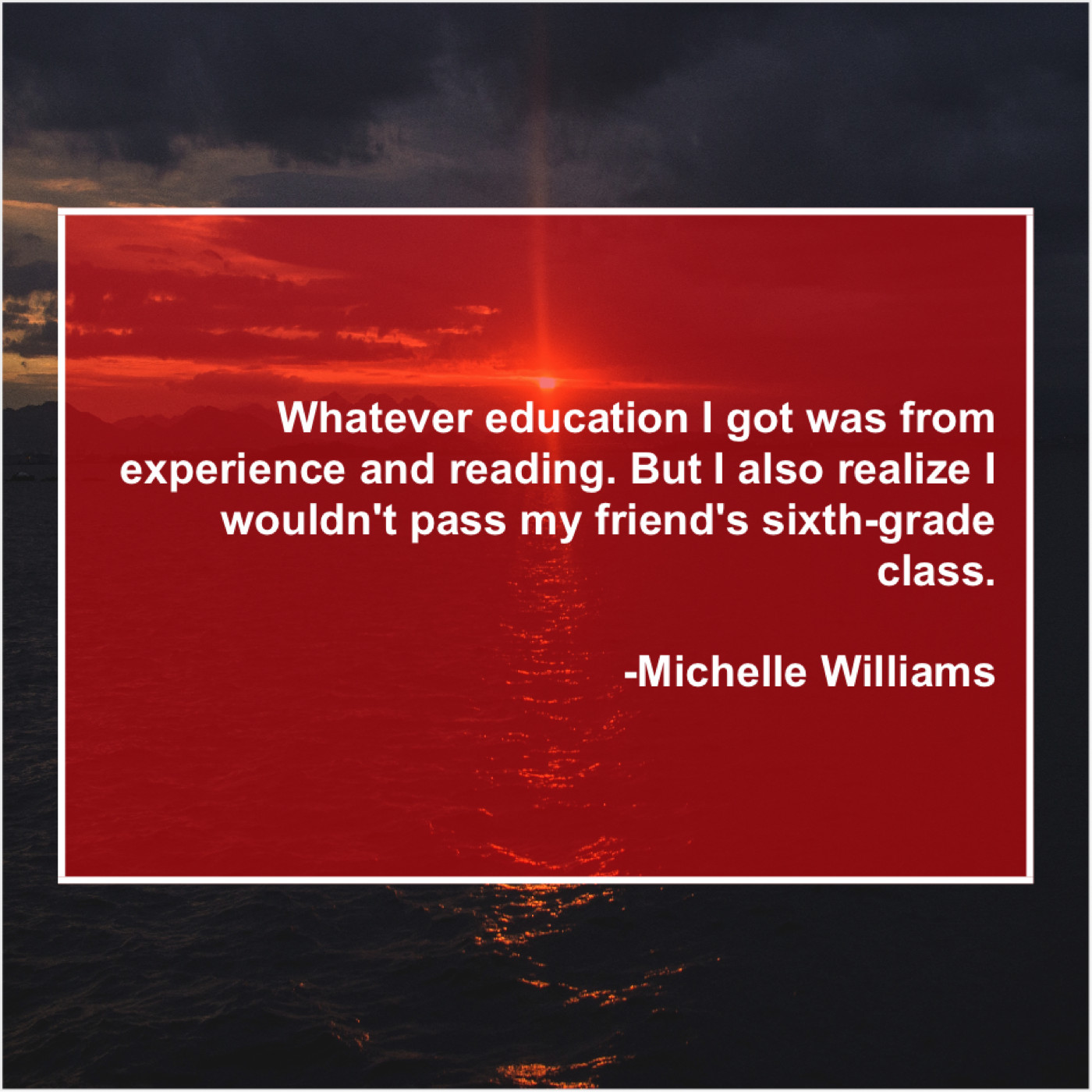 Michelle Williams Michelle Williams – Whatever education I got was… August 10, 2019 admin “Whatever education I got was from experience and reading. But I also realize I wouldn’t pass my friend’s sixth-grade class.”-Michelle Williams